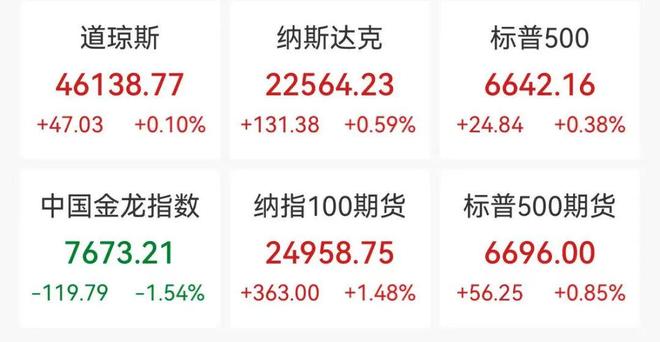 编辑丨曾静娇 北京时间20日凌晨,美国三大股指小幅收涨,道指涨0.1%报46138.77点,标普500指数涨0.38%报 6642.16点,纳指涨0.59%报22564.23点。 | 道琼斯 | 纳斯达克 | 标普500 | | --- | --- | --- | | 46138.77 | 22564.23 | 6642.16 | | +47.03 +0.10% | +131.38 +0.59% | +24.84 +0.38% | | 中国金龙指数 | 纳指100期货 | 标普500期货 | | 7673.21 | 24958.75 | 6696.00 | | -119.79 -1.54% | +363.00 +1.48% | +56.25 +0.85% | 大型科技股多数上涨,万得美国科技七巨头指数涨0.87%。个股方面,谷歌涨3%,英伟达涨近3%,特 斯拉涨0.68%,苹果涨0.42%,亚马逊涨0.06%,微软、脸书跌超1%。 记者丨黎雨桐 消息面上,英伟达公布财报显示,英伟达第三财季营收为570.1亿美元,超出市场预期的549.2亿美元; 净利润为319.1亿美元,同比大涨65%,经调整后的每股收益为1 ...
