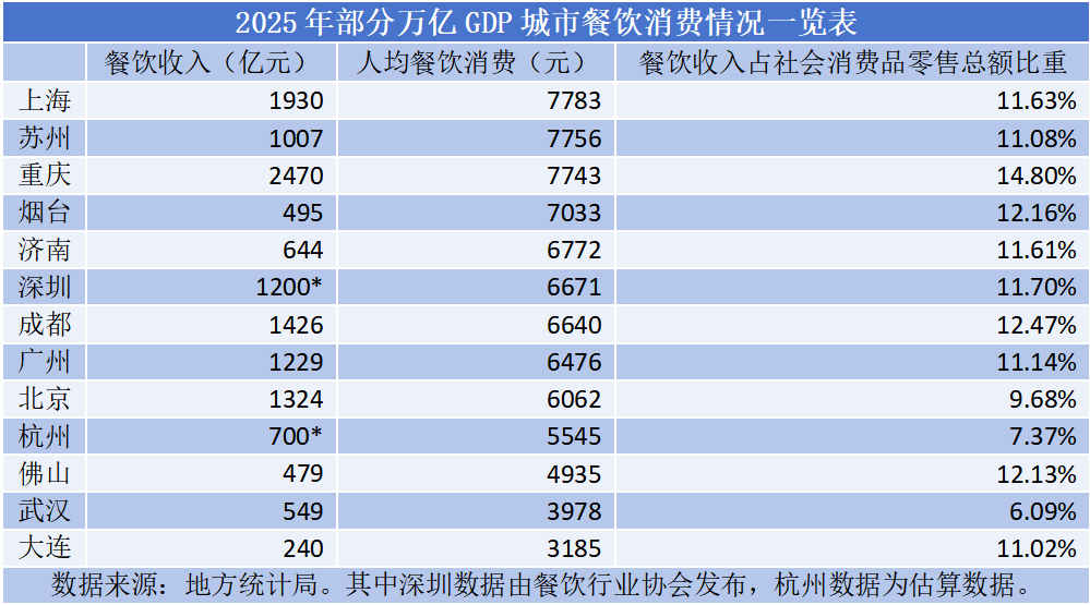21世纪经济研究院 研究员 李果 2025年,哪一座城市的居民最愿意把钱花在"吃"上面? 2月12日,通过对已公布2025年餐饮消费数据的13座万亿GDP城市进行梳理,21世纪经济研究院发现有4座城市的人均餐饮消费超过7000元,分 别是上海、苏州、重庆和烟台,另有5城人均餐饮消费超6000元。此外重庆餐饮消费占社会消费品零售总额的比重最高,达到14.80%,显示出 重庆餐饮消费的极高活跃度。 | | | 2025 年部分万亿 GDP 城市餐饮消费情况一览表 | | | --- | --- | --- | --- | | | 餐饮收入(亿元) | 人均餐饮消费(元) | 餐饮收入占社会消费品零售总额比重 | | 上海 | 1930 | 7783 | 11.63% | | 苏州 | 1007 | 7756 | 11.08% | | 車 天 | 2470 | 7743 | 14.80% | | 烟台 | 495 | 7033 | 12.16% | | 济南 | 644 | 6772 | 11.61% | | 深圳 | 1200* | 6671 | 11.70% | | 成都 | 1426 | 6640 | 12. ...
