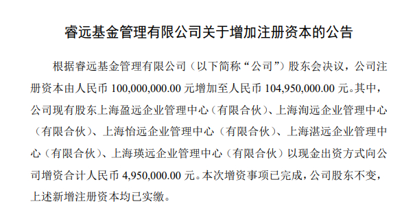 21世纪经济报道记者 杨娜娜 2月10日,睿远基金发布关于增加注册资本的公告。公告显示,公司注册资本由1亿元增加至1.0495亿 元,五家员工持股平台合计增资495万元。本次增资事项已完成,陈光明、傅鹏博等仍是持股比例居前 的股东。 睿远基金此次并非因经营承压让股东"输血",而是通过内部员工持股平台让核心团队增持公司股权。 本次新增的495万元注册资本,均由睿远基金现有的员工持股平台以现金方式出资。参与增资的5位现有 股东分别为上海盈远企业管理中心(有限合伙)、上海洵远企业管理中心(有限合伙)、上海怡远企业 管理中心(有限合伙)、上海湛远企业管理中心(有限合伙)、上海瑛远企业管理中心(有限合伙)五 家企业。 其中,由公司实控人陈光明担任执行事务合伙人的上海瑛远在本次增资中出资最多。据天眼查数据,本 次增资前上海瑛远认缴的出资额为135.01万元,按本次增资后的出资额460.01万元计算,其新增出资额 达到325万元,为5位增资股东中最多的一家,占比超过65%。作为公募行业重量级人物的陈光明,也正 通过资本纽带将自身利益与公司命运更紧密地绑定在一起。 其中,由实控人陈光明执掌的上海瑛远出资最多,占增资总额65% ...