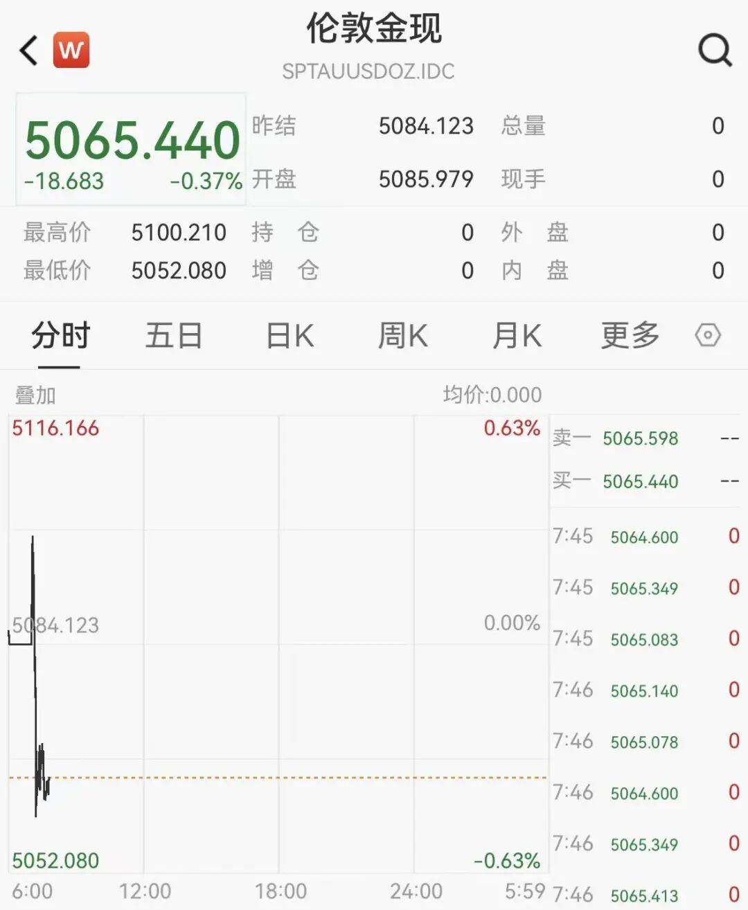 2月12日,黄金白银开盘冲高后短线下挫,截至7:45,现货黄金跌0.37%,报5065.4美元/盎司,现货白银跌0.74%,报83.6美元/盎司,此前白银跌幅一度扩 大至1.2%。 | < W | 伦敦金现 | | | | | | --- | --- | --- | --- | --- | --- | | | SPTAUUSDOZ.IDC | | | | | | 5065.440 #4 | | | 5084.123 总量 | | 0 | | -18.683 | -0.37% 十益 | | 5085.979 现手 | | 0 | | 最高价 | 5100.210 持 仓 | | 0 | 外 盘 | 0 | | 最低价 | 5052.080 | 增 仓 | 0 | 内 盘 | 0 | | 分时 | モ日 日K | | | 月K 車を | (0) | | 叠加 | | | 均价:0.000 | | | | 5116.166 | | | | 0.63% 卖一 5065.598 | | | | | | | 头一 5065.440 | | | | | | | 7:45 5064.600 7:45 5065.349 | 0 ...