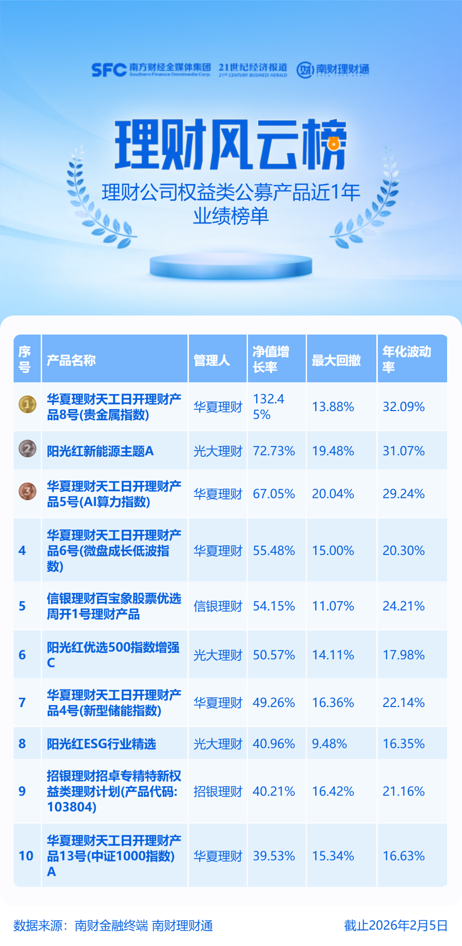 数据说明: 把时间拉长到近一年(2025年2月6日-2026年2月5日,下同)来看,A股三大指数震荡走强。其中创业板指涨超58%领涨,深证 成指、上证指数分别涨超37%、26%。 就板块表现而言,31个申万一级行业近1年均上涨,有色金属、通信分别涨超106%、91%涨幅居前,银行、食品饮料等板块涨幅 较小。 榜单排名来自理财通AI全自动化实时排名,如您对数据有疑问,请在文末联系助理进一步核实。 | ਗੁ ਕੁਗ | 产品名称 | 净值赔 管理人 长率 | 最大回撤 | 年化波动 ਡੂਟ | | --- | --- | --- | --- | --- | | | 华夏理财友 日开理财产 品8号(贵金属指数) | 132.4 华夏理财 5% | 13.88% | 32.09% | | | 阳光红新能源主题A | 光大理财 72.73% | 19.48% | 31.07% | | | 华夏理财天工日开理财产 品5号(AI算力指数) | 华夏理财 67.05% 20.04% | | 29.24% | | 4 | 华夏理财天工日开理财产 品6号(微盘成长低波指 | 华夏理财 55.48% | 15.00% | 20.3 ...