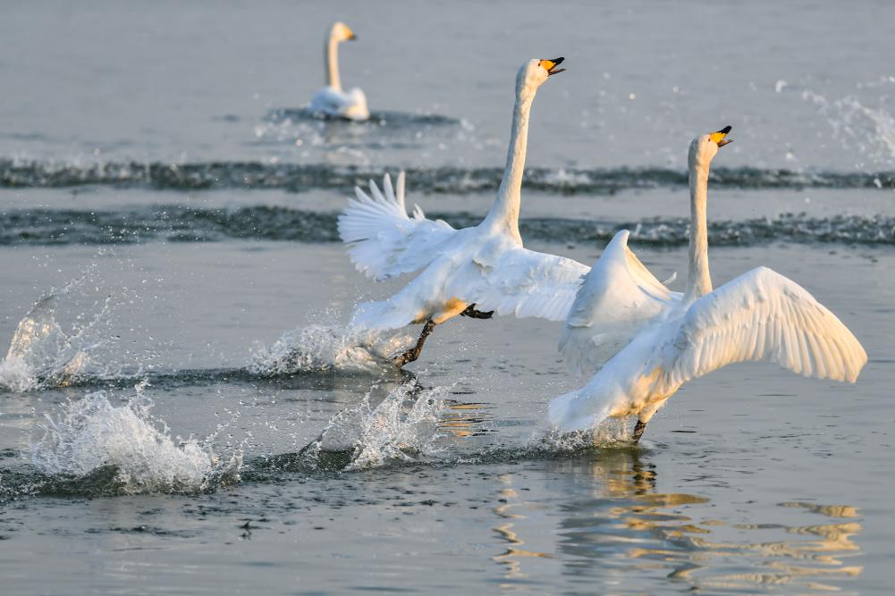 数千只大天鹅飞抵山西平陆黄河湿地越冬