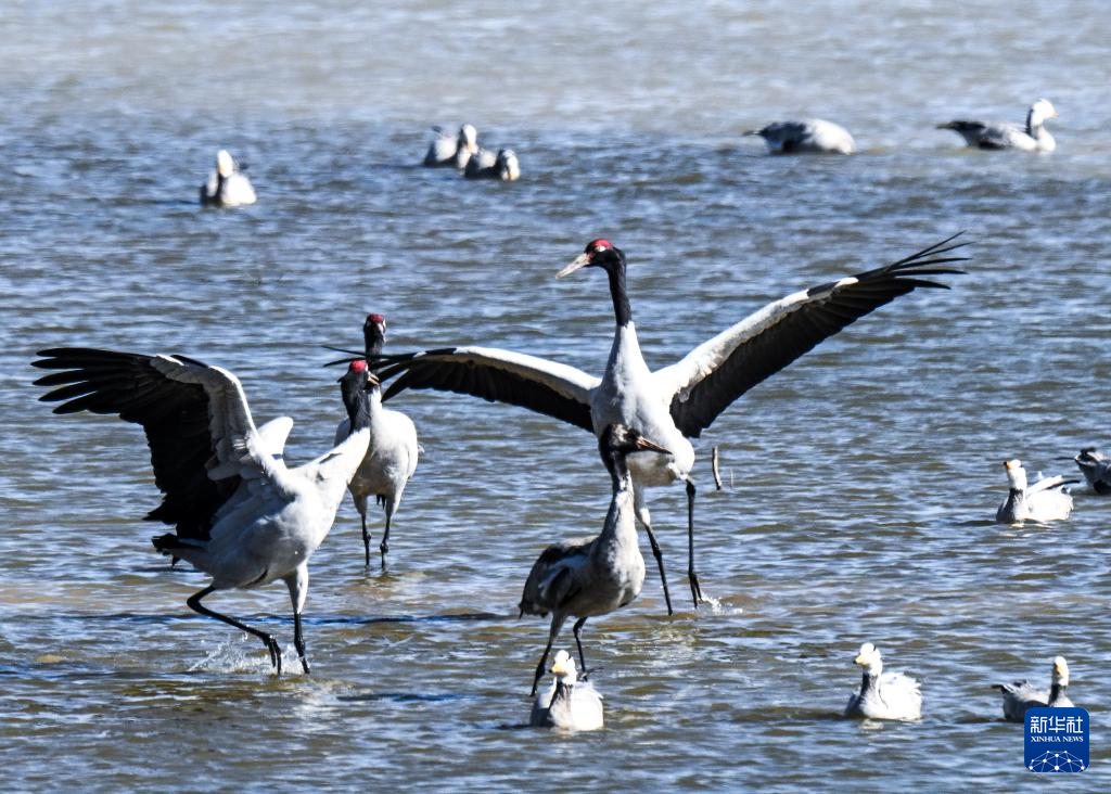 1月29日在贵州草海国家级自然保护区拍摄的越冬的黑颈鹤等鸟类。 冬日,地处贵州省毕节市威宁县的草海国家级自然保护区呈现万鸟翔集的生态美景,黑颈鹤、灰鹤以及斑头雁等大批候鸟来此越冬。 ...