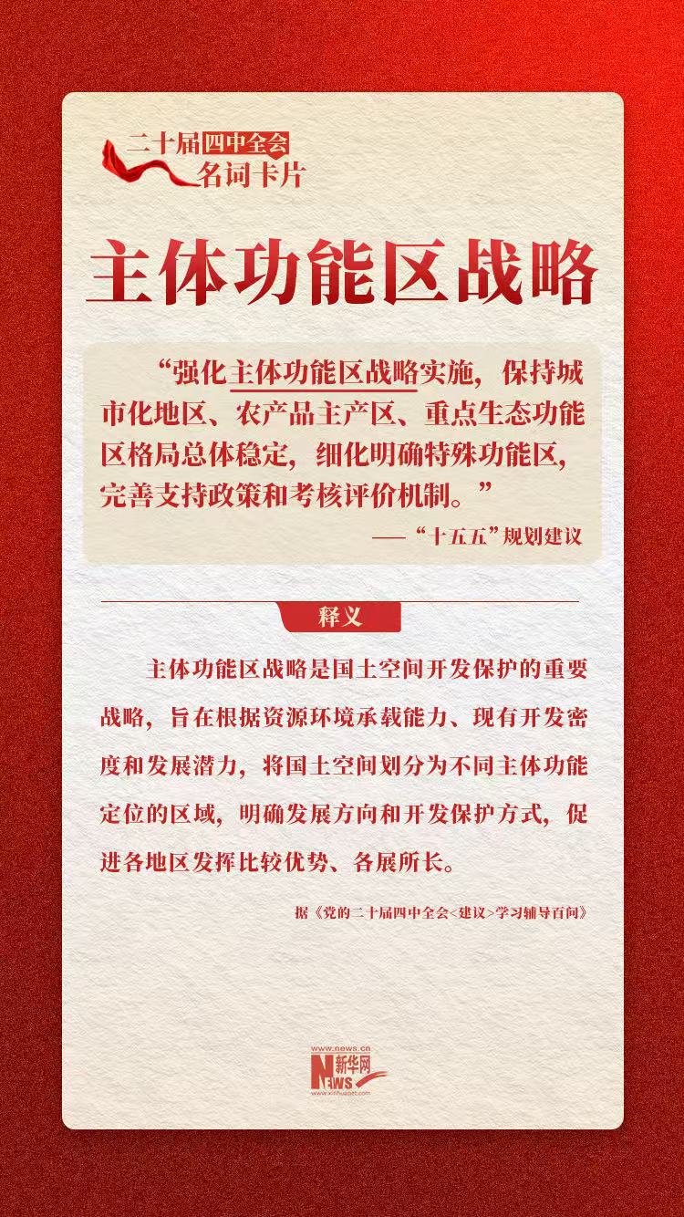 一十届四中全会 名词卡片 主体功能区战略 "强化主体功能区战略实施。保持城 市化地区、农产品主产区、重点生态功能 区格局总体稳定,细化明确特殊功能区, 完善支持政策和考核评价机制。" -"十五五"规划建议 释义 主体功能区战略是国土空间开发保护的重要 战略,旨在根据资源环境承载能力、现有开发密 度和发展潜力,将国土空间划分为不同主体功能 定位的区域,明确发展方向和开发保护方式,促 进各地区发挥比较优势、各展所长。 据《党的二十届四中全会《建议>学习辅导百问》 延伸阅读 发展现状: 目前,我国已总体形成"两横三纵"城镇化战略格局、"七区二十三带"农业发展格局、"三区四带"生态 安全格局。在省级国土空间总体规划中,以县(市、区)为基本单元分别确定其主体功能定位。 在城市化地区、农产品主产区、重点生态功能区三大类主体功能区的基础上,叠加确定特殊功能区, 是构建主体功能明显、优势互补、高质量发展的国土空间开发保护新格局的重要举措。 如何部署: 《全国国土空间规划纲要(2021-2035年)》明确要求,细化主体功能区分类。 《建议》提出细化明确特殊功能区,就是结合国土空间规划编制实施,在三大类主体功能区划分的基 础上, ...