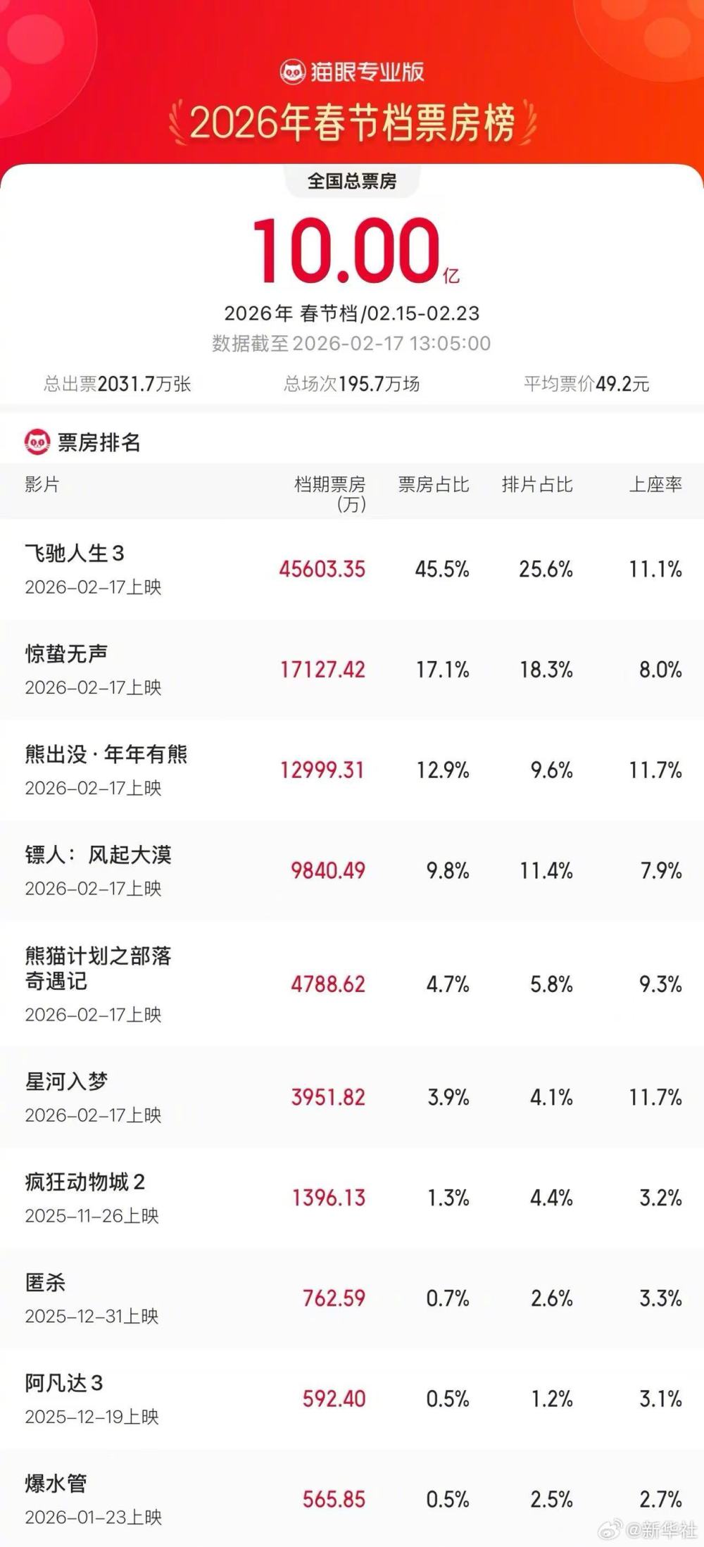 【2026年春节档票房破10亿】据网络平台数据,2026年春节档档期总票房破10亿,《飞驰人生3》,《惊蛰无声》、《熊出没》和《镖 人:风起大漠》分列2026年春节档票房榜前四。 一起聊聊,你最期待哪部春节档电影? | | | ...