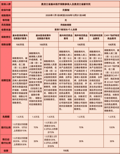 "龙江惠民保2026版"参保时间延长至12月30日中午12时正式关闭。为帮助广大民众抓住最后参保时 机,安心享受全年健康保障,现就"龙江惠民保2026版"具体保障内容进行梳理与说明,助您全面了解这 一惠民政策。 | 投保人群 | | | 黑龙江省基本医疗保险参保人及黑龙江省新市民 | | | | | --- | --- | --- | --- | --- | --- | --- | | 投保年齡 | | | 无限制 | | | | | 保险期间 | | | 2026年1月1日0时至2026年12月31日24时 | | | | | 等待期 | | | 元 | | | | | 用药期限 | | | 同保险期限 | | | | | 保费来源 | | | 医保个账划扣/个人自费 | | | | | 基本医保政策内 保险责任 | 基本医保政策外 | | 国内特定药品 | 海外特定药品 | 早见病特定药 | CAR-T治疗特定 | | 住院医疗费用 | 佳院医疗费用 | | 费用 | 费用 | 品费用 | 药品费用 | | 保险金额 100万元 | 100万元 | | | 100万元 | | 100万元 | | | | ...