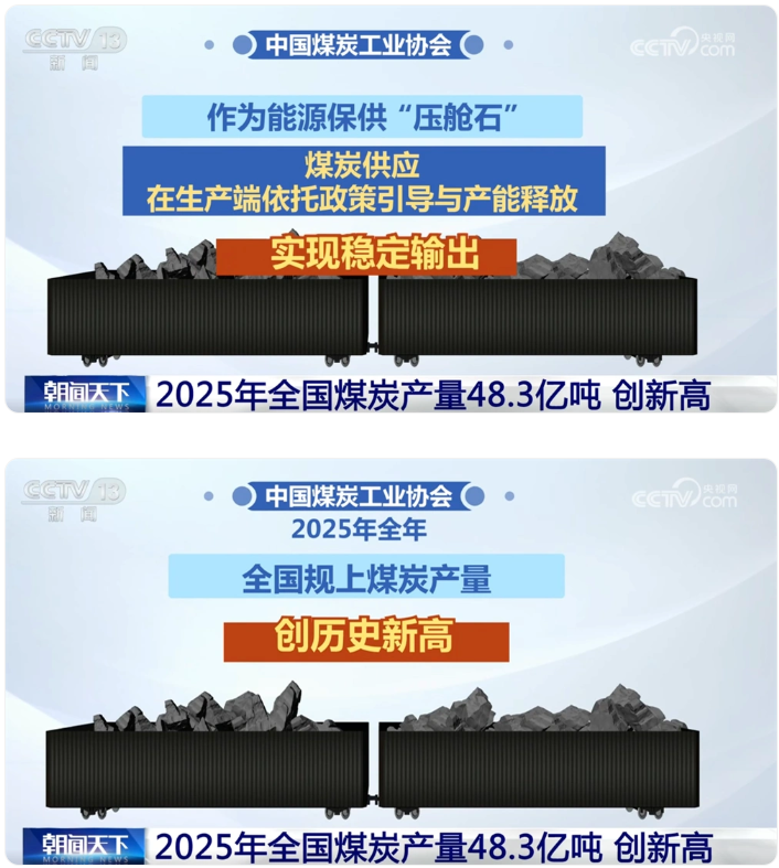 记者从中国煤炭工业协会了解到,2025年全国规上煤炭产量完成48.3亿吨,同比增长1.2%,创历史新 高。 记者从中国煤炭工业协会了解到,作为能源保供"压舱石",煤炭供应在生产端依托政策引导与产能释放 实现稳定输出,2025年全年全国规模以上煤炭产量创历史新高;山西、陕西、内蒙古和新疆四省区煤炭 产量占全国总产量的82%左右,四省区煤炭调出量占全国跨省区外调量的95%以上,对保障全国煤炭安 全稳定供应发挥了重要作用。 我国最新印发了《煤炭清洁高效利用重点领域标杆水平和基准水平(2025年版)》,推动煤炭产业由低端 向高端、煤炭产品由初级燃料向高价值产品攀升。 中国煤炭工业协会数据显示,我国煤化工原料耗煤量正以每年2000万至3000万吨的规模持续增长。新标 准进一步明确将燃煤发电供热煤耗、煤制天然气等纳入能效管控重点领域,设立标杆与基准水平,此举 将有力推动煤炭从燃料向原料的应用拓展。 在石家庄,一列列来自山西阳泉、陕西榆林的运煤火车正将煤炭源源不断送至国家电投良村热电。通过 科学调控调运节奏,实现日均接卸火车2—3列,到厂量达7000吨—10000吨,可充分满足当地热电发电 供暖生产需求。 中国煤炭工业协会 ...