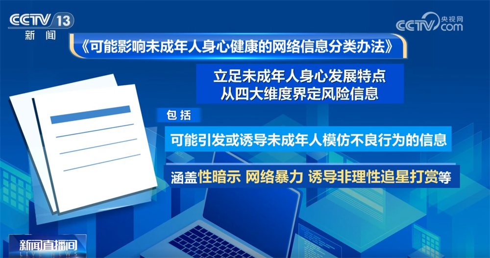 可能引发或诱导未成年人模仿不良行为的信息,涵盖性暗示、网络暴力、诱导非理性追星打赏等; 央视网消息:近日,国家网信办、国家新闻出版署、教育部等八部门发布《可能影响未成年人身心健康的网络信息分类办法》,自今年3 月1日起施行。《办法》首次将影响未成年人身心健康的网络信息细化为四大类,让网络监管和治理"清晰可判",为未成年人筑牢网络安全屏 障。 《办法》立足未成年人身心发展特点,从四大维度界定风险信息,包括: 可能对未成年人价值观造成负面影响的内容,涵盖炫富拜金、畸形审美、"读书无用论"等错误观念; 除了明确风险边界,《可能影响未成年人身心健康的网络信息分类办法》更对网络平台和内容生产者提出刚性约束,从信息展示、算法推 荐到提示标识等方面,构建全链条防护体系,以精细化治理守护未成年人网络空间。 不当使用未成年人形象的信息,涵盖利用未成年人摆拍牟利、通过恶搞未成年人等方式博取关注; 不当披露未成年人个人信息的行为,涵盖未经监护人同意不得展示不满十四周岁未成年人的学习、生活等场景。 中国社会科学院大学互联网法治研究中心主任 刘晓春:这种精细化的分类最大的好处就是以前大家觉得比较模糊不清的一些内容,分类 办法里面比较清 ...