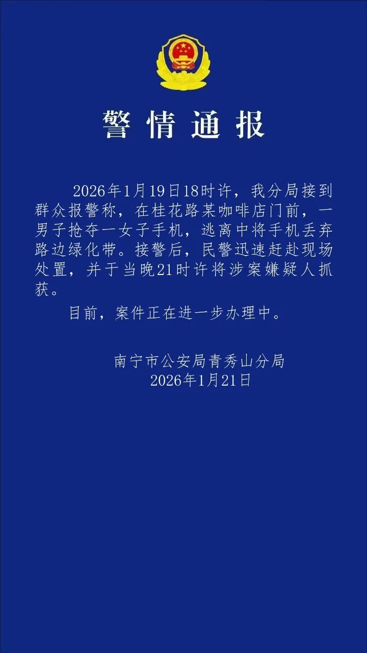 央视网消息:据青秀山警方微信公众号消息,1月21日,南宁市公安局青秀山分局发布警情通报。1 月19日18时许,南宁市公安局青秀山分局接到群众报警称,在桂花路某咖啡店门前,一男子抢夺一女子 手机,逃离中将手机丢弃路边绿化带。接警后,民警迅速赶赴现场处置,并于当晚21时许将涉案嫌疑人 抓获。目前,案件正在进一步办理中。 ...