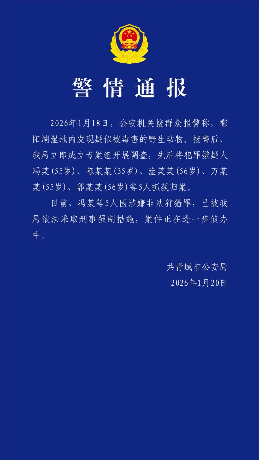 央视网消息:据共青公安微信公众号消息,1月20日,江西共青城市公安局发布警情通报。1月18日,公安机关接群众报警称,鄱阳湖湿地内发现疑似被毒 害的野生动物。接警后,该局立即成立专案组开展调查,先后将犯罪嫌疑人冯某(55岁)、陈某某(35岁)、淦某某(56岁)、万某某(55岁)、郭某某 (56岁)等5人抓获归案。 目前,冯某等5人因涉嫌非法狩猎罪,已被该局依法采取刑事强制措施,案件正在进一步侦办中。 ...