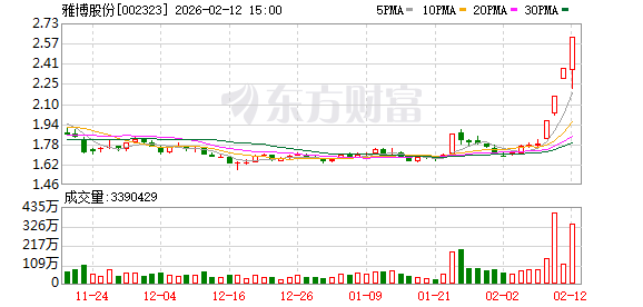 证券日报网讯 2月12日,雅博股份发布公告称,公司股票连续二个交易日(2026年2月11日和2026年2月 12日)日收盘价格涨幅偏离值累计超过20%,根据《深圳证券交易所交易规则》的有关规定,属于股票 交易异常波动的情形。公司董事会确认,除公司已披露的信息外,公司目前没有任何根据深交所《股票 上市规则》等有关规定应予以披露而未披露的事项或与该事项有关的筹划、商谈、意向、协议等;董事 会也未获悉公司有根据深交所《股票上市规则》等有关规定应予以披露而未披露的、对公司股票及其衍 生品种交易价格产生较大影响的其他信息。公司前期披露的信息不存在需要更正、补充之处。 (文章来源:证券日报) ...