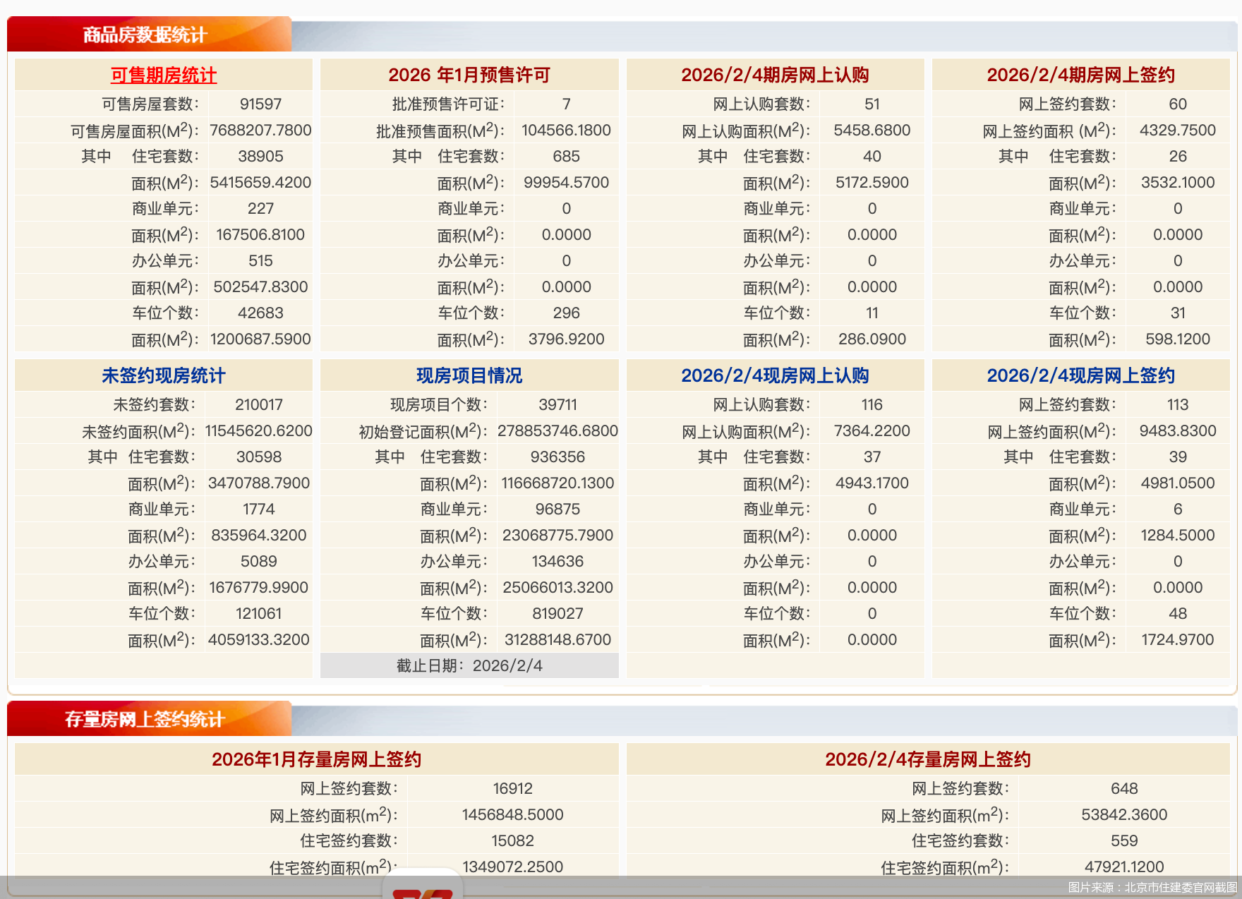 Group 1 - The core viewpoint of the articles highlights the current state of the real estate market in Beijing, focusing on new and second-hand housing transactions as of February 4, 2026 [1][2][3] Group 2 - On February 4, 2026, Beijing recorded 173 new housing transactions with a total area of 13,813.58 square meters, including 65 residential transactions covering 8,513.15 square meters [1] - The second-hand housing market saw 648 transactions, totaling 53,842.36 square meters, with 559 of these being residential transactions amounting to 47,921.12 square meters [1] - As of February 4, 2026, there are 91,597 units available for sale, with a total area of approximately 7,688,208 square meters, including 15,151 residential units covering about 5,415,659 square meters [2] - The total number of unsold units stands at 210,017, with a total area of approximately 11,545,620 square meters, including 30,598 residential units covering about 3,470,789 square meters [2] - In January 2026, the online signing for existing homes reached 16,912 units, with a total area of approximately 1,456,848.5 square meters, including 15,082 residential units covering about 1,349,072.25 square meters [3]