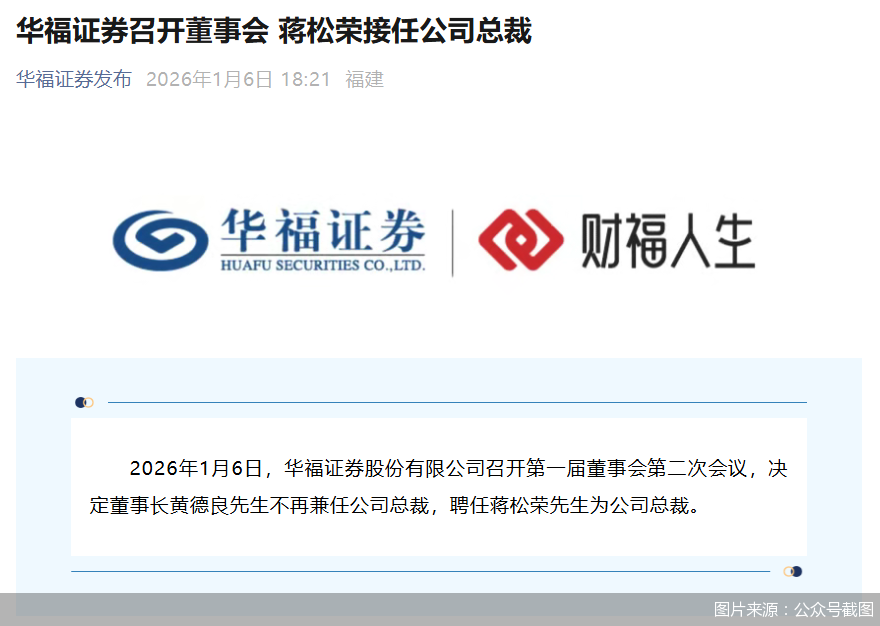 北京商报讯(记者 刘宇阳 实习生 姚榕琰)1月6日,据"华福证券发布"微信公众号信息,当日,华福证券召开董事会会议, 决定董事长黄德良不再兼任公司总裁,聘任蒋松荣为公司总裁。 ...