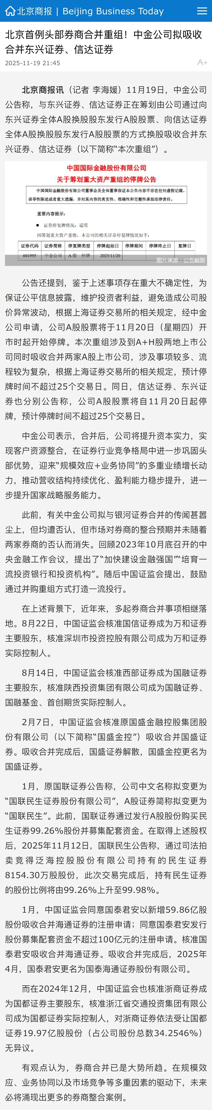 【#北京首例头部券商合并重组#!#中金拟吸收合并东兴证券信达证券# 】11月19日,中金公司公告 称,与东兴证券、信达证券正在筹划由公司通过向东兴证券全体A股换股股东发行A股股票、向信达证 券全体A股换股股东发行A股股票的方式换股吸收合并东兴证券、信达证券(以下简称"本次重组")。 公告还提到,鉴于上述事项存在重大不确定性,为保证公平信息披露,维护投资者利益,避免造成公司 股价异常波动,根据上海证券交易所的相关规定,经中金公司申请,公司A股股票将于11月20日(星期 四)开市时起开始停牌。本次重组涉及到A+H股两地上市公司同时吸收合并两家A股上市公司,涉及事 项较多、流程较为复杂,根据上海证券交易所的相关规定,预计停牌时间不超过25个交易日。同日,信 达证券、东兴证券也分别公告称,公司A股股票将自11月20日起停牌,预计停牌时间不超过25个交易 日。(北京商报记者 李海媛) 图片来源:公告裁图 8月14日,中国证监会核准西部证券成为国融证券 主要股东,核准陕西投资集团有限公司成为国融证券、 国融基金、首创期货实际控制人。 2月7日,中国证监会核准原国盛金融控股集团股 份有限公司 (以下简称"国盛金控") 吸收 ...