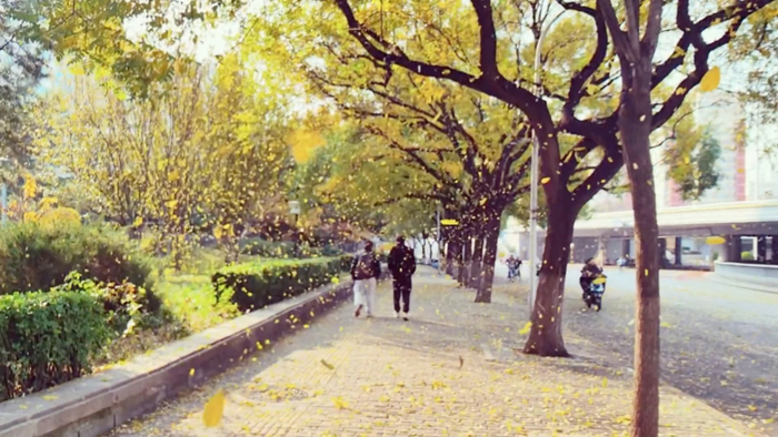 北京城区现银杏雨,古建筑与白蜡树相映成趣