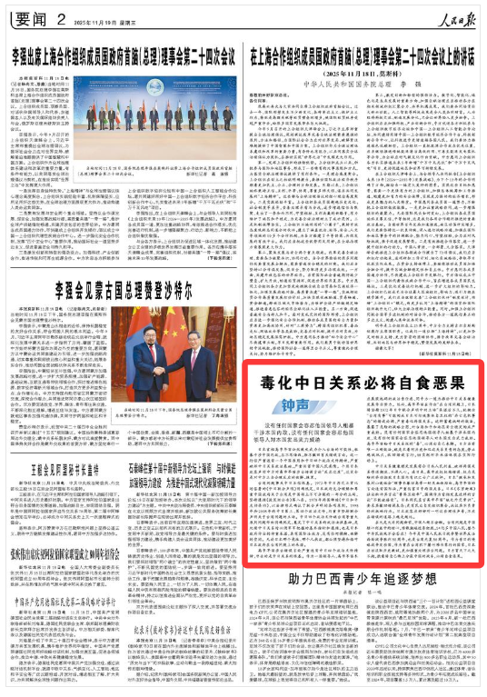 要闻 2 2005年11月18 人民日於 李强出席上福合作纲组成员国政府首届 总理 理事会第二 李强会见蒙古国品理费登沙特! 助力巴西青少年追逐梦想 11月19日,《人民日报》2版刊发"钟声"评论文章《毒化中日关系必将自食恶果》。文章指出,没有任 何国家会容忍他国领导人粗暴干涉本国内政,没有任何国家会容忍他国领导人对本国发出武力威胁。 全文如下 -- 的中日第三、第四个政治文件,均重申坚持联合声明关于台湾问题的立场。中日四个政治文件就台湾等 重大原则问题作出明确规定,奠定了中日关系的政治法律基础,是处理中日关系时必须牢牢把握的基本 指针和遵循,也是日本政府作出的郑重承诺,具有国际法效力,没有任何模糊、曲解的空间。无论日本 哪个党派、哪个人执政,都必须坚持和恪守日本政府在台湾问题上的承诺。 高市早苗涉台错误言论严重违背中日四个政治文件精神,冲击的是中日关系的根基。作为一国领导人, 高市早苗本应展现起码的政治责任感,同中方一道为推动中日关系健康发展作出努力。然而,高市早苗 在作出"在台湾问题上,日本将坚持1972年日中联合声明中的立场"承诺后不久,就抛出"台湾有事"可能 构成日本可行使集体自卫权的"存亡危机事态" ...