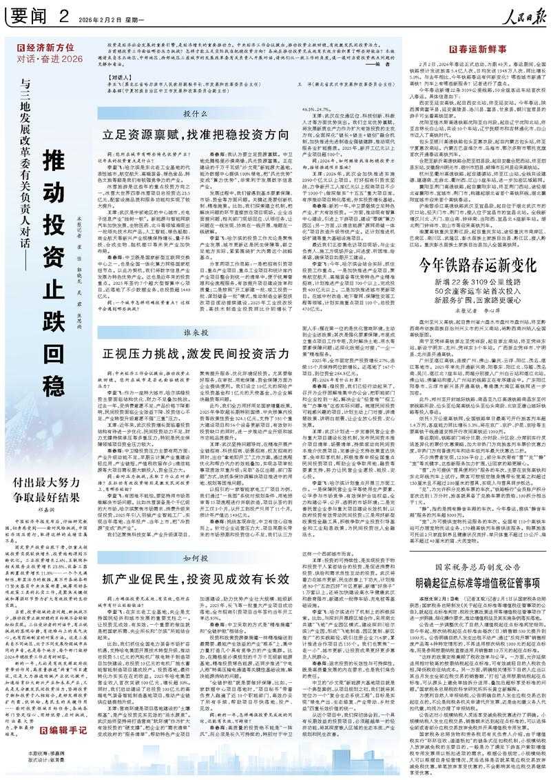 餐食包装车间里饭菜香气四溢,两台封膜机发出"咔哒"声,将餐盒整齐封装。 经过十几道严格工序后,1万多份盒饭由恒温冷藏车配送至北京西站等火车站分拨站点,继而送到 旅客手中。 镜头2:高速路顺畅是最美的风景 记者探访铁路、公路、水运、民航一线岗位 春运首日的四组镜头 《人民日报》(2026年02月03日 第 01 版) 2月2日,春运首日全社会跨区域人员流动量预计18791万人次,比2025年春运首日增长13%。记者 深入铁路、公路、水运、民航一线岗位探访,见证归途中的硬核保障,定格出行路上的温暖瞬间。 镜头1:铁路盒饭在这里配餐 早上6时许,天还没亮,国铁北京局高铁配餐生产加工基地的原料收货平台已灯火通明,一辆辆冷 藏运输车将2000多斤新鲜食材陆续卸运到位。 镜头4:机场行李搬运用上智能系统 6时02分,北京大兴国际机场迎来春运首日的第一架进港航班。约半小时后,第一件行李稳稳抵达 行李提取转盘。 中控室大屏上,一张电子地图直观显示了机场6个分拣机、22个进港行李转盘、41个出港行李转盘 等的运行状态。新部署的智能行李搬运系统正在作业。 突然,大屏上的1号分拣机闪现红色。大兴机场航站楼管理部行李模块经理徐林走进 ...