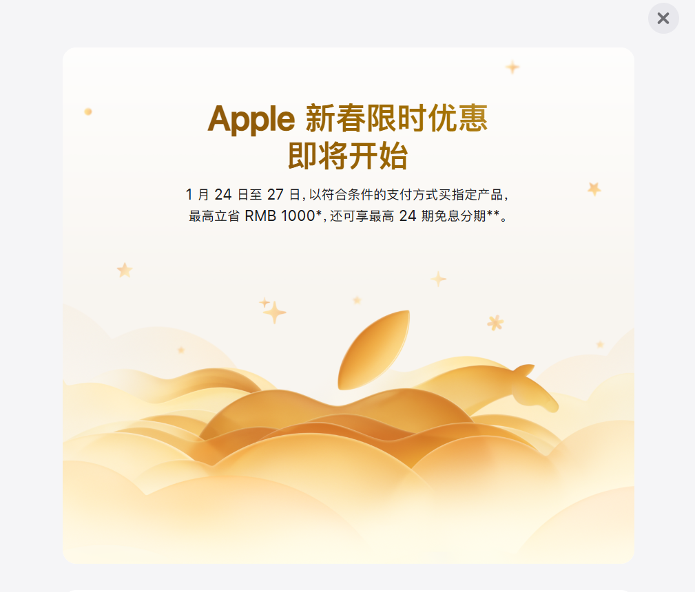 苹果中国官网最新上线新春限时优惠活动。 用户于2026年1月24日0时1分至1月27日23时59分以符合条件的支付方式购买iPhone、Mac、iPad和Apple Watch等指定产品最高立省1000元。但最 新发布的iPhone 17系列手机产品不在降价范围内。 2025年12月8日,苹果官方宣布在京东、天猫等平台的旗舰店推出年末降价活动。其中,iPhone 17 Pro及iPhone 17 Pro Max机型每部降价300元, 优惠后,iPhone 17 Pro售价8699元/部起,iPhone 17 Pro Max售价9699元/部起。此外,部分地区可享国家补贴,最高可省500元/部。 苹果公司此前发布的2025财年第四季度财报(截至2025年9月27日)显示,苹果2025年第四财季总营收为1024.66亿美元,创同期历史纪录,较 2024年同期的949.30亿美元增长8%;净利润达274.66亿美元,较2024年同期的147.36亿美元大幅增长86%。 其中,2025年第四财季iPhone营收同比增长6.1%,达到490亿美元,但仍略低于分析师预期的501亿美元。 值得注意的是,苹果2025年第四财 ...