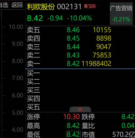 这类股被错杀了吗? 今日(1月22日)上午,周期板块再度上行。截至上午收盘,建筑材料指数大涨超2%,国防军工、石油石化等指数均大涨超2%,钢铁、煤炭等板块指数 均涨超1%。 | 3选 返回 | | 利欧股份 002131 R500 | | 告官销 | | --- | --- | --- | --- | --- | | 10.00 | | 8.42 -0.94 -10.04% | | -0.21% | | | 卖五 | 8.46 | 10155 | | | 9.00 | ਭੂਦ 70 | 8.45 | 8898 | | | | 卖三 | 8.44 | 9047 | | | 8.00 | | 8.43 | 75853 | | | | 英 | 8.42 11988402 | | | | 7.00 | द्रोह | | | | | | 买 | | | | | 6.00 | 买三 | | | | | | 买四 | | | | | 5.00 | 买五 | | | | | | 涨停 | 10.30 跌停 | | 8.42 | | 4.00 | 最高 | 8.42 量比 | | 0.04 | | | 最低 | 8.42 市 ...