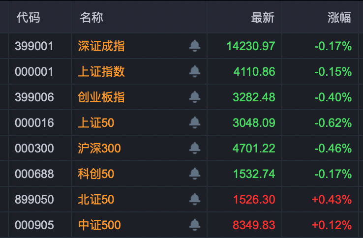 盘面上,国防军工、石油、玻璃玻纤、草甘膦等板块涨幅居前,贵金属、电网设备、医疗美容、光刻机等板块跌幅居前。 今日早盘,A股高开后小幅震荡,上证指数、深证成指、创业板指、科创50等均在红绿间多次转换。上涨个股远多于下跌个股,成交呈温和放大趋势。 | 代码 | 名称 | | 最新 | 涨幅 | | --- | --- | --- | --- | --- | | 399001 | 深证成指 | | 14230.97 | -0.17% | | 000001 | 上证指数 | . | 4110.86 | -0.15% | | 399006 | 创业板指 | . | 3282.48 | -0.40% | | 000016 | 上证50 | . | 3048.09 | -0.62% | | 000300 | 沪深300 | . | 4701.22 | -0.46% | | 000688 | 科创 50 | | 1532.74 | -0.17% | | 899050 | 北证50 | . | 1526.30 | +0.43% | | 000905 | 中证500 | | 8349.83 | +0.12% | 多只股票开盘快速 ...