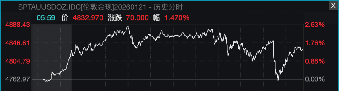 最新消息。 美股方面,昨夜美股三大指数全线收涨,道指涨1.21%,标普500指数涨1.16%,纳指涨1.18%。 | 代码 | 名称 | 现价 | 涨跌幅 | | --- | --- | --- | --- | | DJI | 道琼斯工业平均 | 49077.23c | 1.21% | | IXIC | 纳斯达克指数 | 23224.82c | 1.18% | | SPX | 标普500 | 6875.62c | 1.16% | 大型科技股多数收涨,英特尔涨超11%,AMD涨超7%,特斯拉、英伟达涨近3%,谷歌涨近2%,高通涨超1%,苹果、亚马逊小幅上涨。 昨夜尾盘,黄金、白银走出深"V"行情。现货白银一度跳水跌超4.5%,之后快速拉升,截至收盘跌幅为1.54%,报93.102美元/盎司。现货黄金振幅较小, 盘中也一度快速回调,最终收涨1.47%,报4832.97美元/盎司。 消息面上,此前对于夺取格陵兰岛态度非常强硬的特朗普突然松口。当地时间1月21日,特朗普在世界经济论坛上明确表示,不会武力夺取格陵兰岛,他 在与北约秘书长会面后还表示,暂时不会按原定计划向反对美国得到格陵兰岛的欧洲8国加征关税。 不过,特 ...