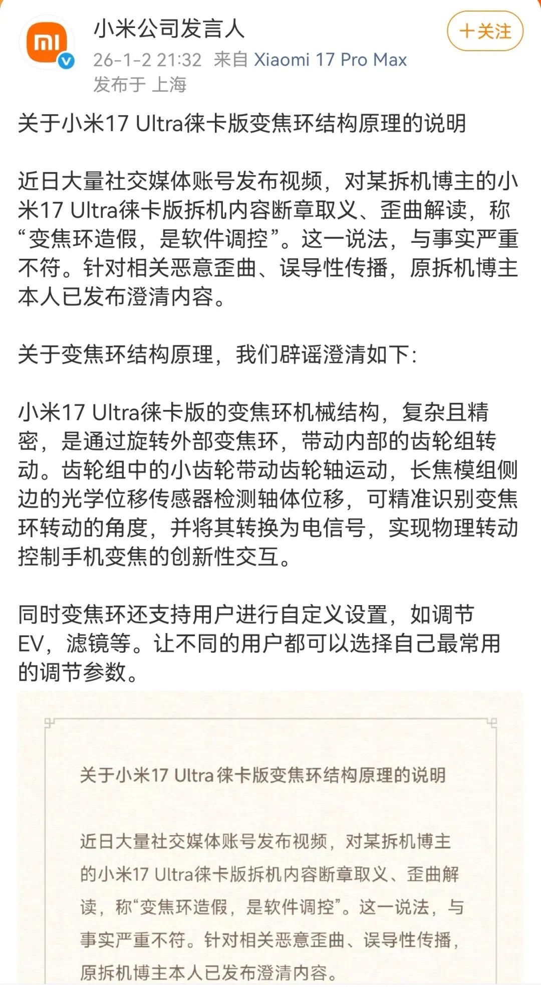 Core Viewpoint - The company has clarified that the claims made on social media regarding the Xiaomi 17 Ultra Leica version's zoom ring being a software manipulation are false and misleading [1][2] Group 1: Clarification of Misleading Claims - Numerous social media accounts have distorted the content of a teardown video by a certain blogger, alleging that the zoom ring is fake and controlled by software [1][2] - The original blogger has issued a clarification in response to the malicious distortion and misleading dissemination of information [1][2] Group 2: Technical Explanation of the Zoom Ring - The zoom ring of the Xiaomi 17 Ultra Leica version features a complex and precise mechanical structure that operates through the rotation of an external zoom ring, which drives an internal gear system [1] - The small gears within the gear system move the gear shaft, while an optical displacement sensor detects the movement of the shaft, accurately recognizing the angle of the zoom ring's rotation and converting it into an electrical signal for physical control of the phone's zoom [1] - The zoom ring also allows users to customize settings, such as adjusting EV and filters, enabling different users to select their most frequently used adjustment parameters [1]
