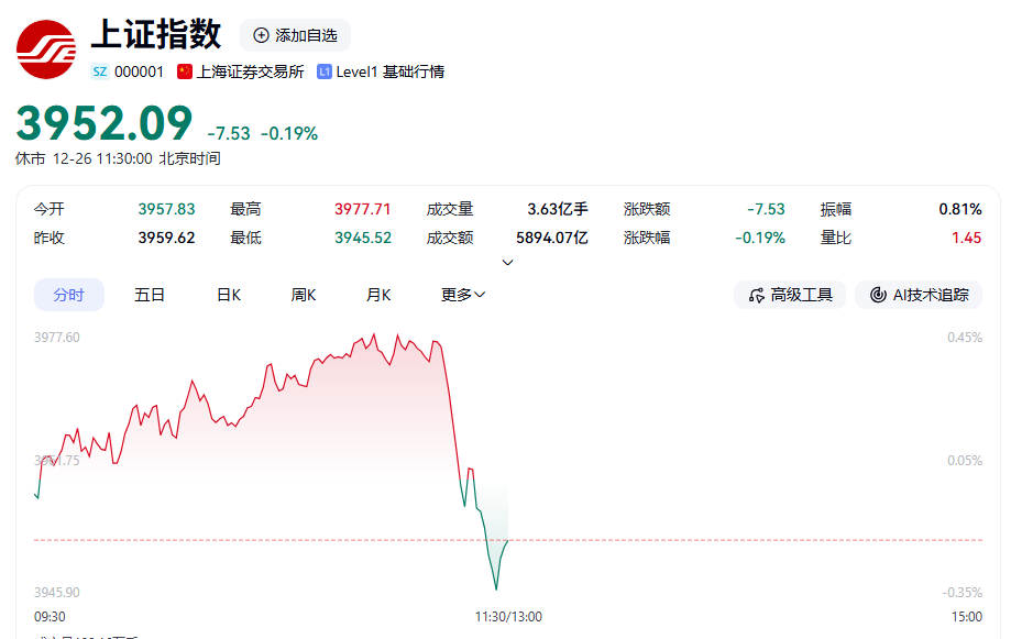 主要股指突然走低。 | 今开 | 3957.83 | 最高 | | 3977.71 | 成交量 | 3.63亿手 | 涨跌额 | -7.53 | 振幅 | 0.81% | | | --- | --- | --- | --- | --- | --- | --- | --- | --- | --- | --- | --- | | 昨收 | 3959.62 | 最低 | | 3945.52 | 成交额 | 5894.07亿 > | 涨跌幅 | -0.19% | 量比 | 1.45 | | | 分时 | 更日 | 日K | 園K | 月K | 更多v | | | 6 高级工具 | | ④ AI技术追踪 | | | 3977.60 | | | | | | | | | | | 0.45% | | | | | | | | | | | | | 0.05% | | 3945.90 | | | | | | | | | | | -0.35% | | 09:30 | | | | | | 11:30/13:00 | | | | | 15:00 | | 15. 4 . 1770 . | | | | | | | | | | | | A股市 ...