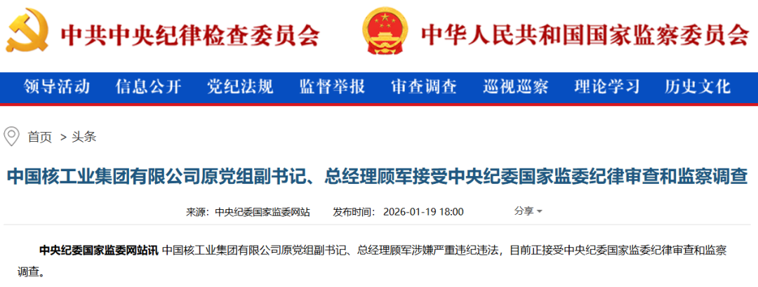 公开资料显示,顾军出生于1963年6月,江苏启东人,曾任国家核电技术公司董事、总经理、党组成员等职,2015年任中国核工业建设集团公司董事、总 经理、党组副书记。 2018年,顾军任中国核工业集团有限公司董事、总经理、党组副书记,2024年不再担任上述职务,至此次被查。 而中国核工业集团有限公司(简称:中核集团,英文缩写:CNNC)是中央直接管理的特大型国有重要骨干企业,是国家核科技工业主体,是推进核能开 发利用、核工程建设、核技术应用的国家队和主力军,拥有完整的核科技工业体系,肩负着推动国防建设和经济社会发展的双重使命。中核集团资产规模 超1.6万亿元,员工总数18万人,连续20年、7个任期国资委考核A级,连续7年获评中央单位定点帮扶工作考核"好"的最高等次。 综合自:中央纪委国家监委网站、长安街知事等 打虎。 据中央纪委国家监委网站消息,中国核工业集团有限公司原党组副书记、总经理顾军涉嫌严重违纪违法,目前正接受中央纪委国家监委纪律审查和监察调 查。 (文章来源:证券时报) ...