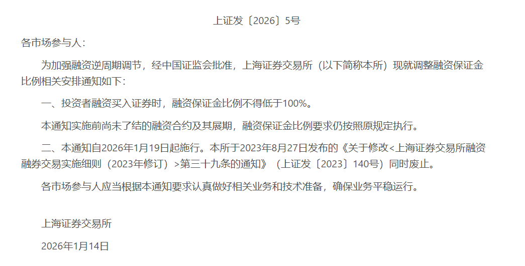 1月14日,经中国证监会批准,沪深北交易所发布通知调整融资保证金比例,将投资者融资买入证券时的融资保证金最低比例从80%提高至100%。 2023年8月,沪深北交易所将融资保证金比例从100%降低至80%,融资规模和交易额稳步上升。近期,融资交易明显活跃,市场流动性相对充裕,根 据法定的逆周期调节安排,适度提高融资保证金比例回归100%,有助于适当降低杠杆水平,切实保护投资者合法权益,促进市场长期稳定健康发 展。 需要说明的是,此次调整仅限于新开融资合约,调整实施前已存续的融资合约及其展期仍按照调整前的相关规定执行。 校对:吕久彪 ...