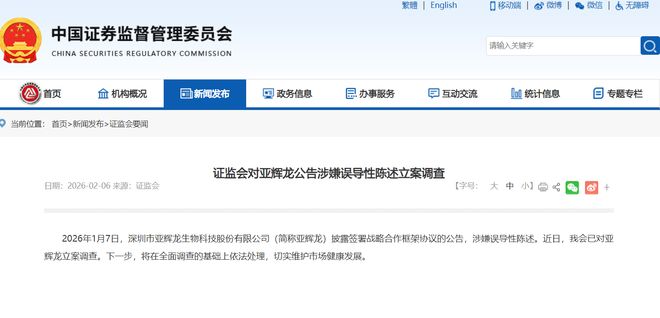 2月26日,证监会官网发布公告称,对亚辉龙公告涉嫌误导性陈述立案调查。 据悉,2026年1月7日,深圳市亚辉龙生物科技股份有限公司(简称亚辉龙)披露签署战略合作框架协议 的公告,涉嫌误导性陈述。近日,证监会已对亚辉龙立案调查。下一步,将在全面调查的基础上依法处 理,切实维护市场健康发展。 同日,亚辉龙亦发布关于收到中国证券监督管理委员会立案告知书的公告。 亚辉龙表示,公司于2026年2月6日收到中国证券监督管理委员会(以下简称"中国证监会")下发的《立 案告知书》,因涉嫌信息披露违法违规,根据《中华人民共和国证券法》《中华人民共和国行政处罚 法》等法律法规,中国证监会决定对公司予以立案。 亚辉龙此次被查与此前披露的公告相关。1月6日晚,亚辉龙发布公告称,于近日与深圳脑机星链科技有 限公司(以下简称:"脑机星链")签署了《战略合作框架协议》。双方将通过整合脑机接口技术与临床 和市场资源,共同开发脑机接口相关在研产品及推进后续市场拓展及推广。亚辉龙同时强调,本次签署 的协议为意向性约定,不涉及具体金额,无需提交公司董事会、股东大会审议。 同日,上交所就紧急向亚辉龙发送了问询函,并对亚辉龙及有关责任人予以监管警示的 ...