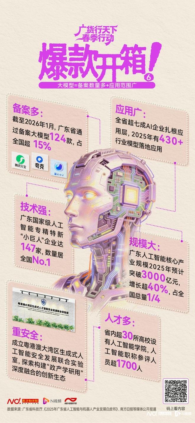 这些大模型背后,是高速增长的产业规模。2025年,广东人工智能核心产业规模预计突破3000亿元,总 量占据全国四分之一,增速超40%。这一数据表明,广东不仅是传统制造业的重镇,更已成为全国人工 智能产业的核心增长极,为大模型的研发与应用提供了丰富的场景需求和雄厚的产业支撑。 广货爆款开箱 开箱!解码广货。每期一爆款,开箱见真章。 从一部智能手机到一辆新能源车,"广货"早已是国民生活中的"硬核存在"。它到底有多能打?爆款背后 藏着怎样的创新密码?南都大数据研究院"广货爆款开箱"专栏上线!用数据带您透视广货从核心零件到 全球布局的真实战力,解码它如何风靡世界。 第六期,开箱一款看不见的"新广货"——人工智能大模型。 在"广货行天下"的版图上,一项看不见却至关重要的"新广货"正崭露头角,它并非实体商品,而是驱动 千行百业智能升级的"南粤智脑"——人工智能大模型。 产业的繁荣,首先体现在合规发展的大模型数量上。截至2026年1月,广东省通过国家备案的大模型数 量已达124款,占全国总量的15%以上。这些备案模型覆盖文化、教育、工业制造、市场营销等多个领 域,标志着广东AI产业正从"单点突破"迈向"生态共振"。 ARR ...