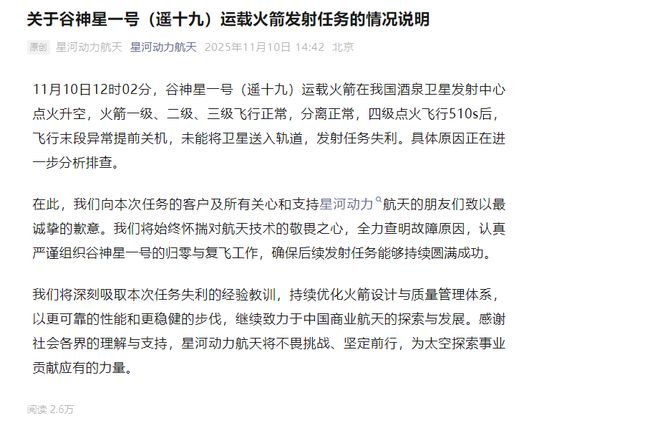 11月10日,正处A股上市辅导备案关键期的北京星河动力航天科技股份有限公司(下称"星河动力")遭 遇了一次发射挫折。 当日12时02分,星河动力谷神星一号(遥十九)运载火箭在酒泉卫星发射中心点火升空。随后,星河动 力发布情况说明称,火箭未能将卫星送入轨道,发射任务失利。 根据情况说明,谷神星一号(遥十九)运载火箭点火升空后,"火箭一级、二级、三级飞行正常,分离 正常,四级点火飞行510s后,飞行末段异常提前关机,未能将卫星送入轨道,发射任务失利"。 谷神星一号再遇挫 对于高度依赖可靠性的航天发射而言,任何一次失利都是沉重的。公开资料显示,这并非星河动力首次 遭遇发射挫折。2023年9月21日,谷神星一号(遥十一)运载火箭在飞行过程中出现姿态失稳,发射任 务也遭遇失利。 彼时,失利的原因是火箭一级发动机的喷管扩张段出现了异常烧蚀。而导致烧蚀的根本原因,是在加工 该组件的螺钉孔时,因操作不当,在碳布层中留下了内部缺陷,最终导致火箭在飞行中姿态失稳。 不过,虽然遭遇了两次失利,但星河动力仍是目前国内民营火箭企业中发射次数最多、成功率最高的公 司之一。 星河动力在说明中致歉,并表示将"全力查明故障原因,认真严谨组织谷 ...