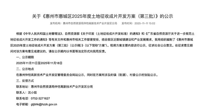 近期,惠州仲恺高新区党工委管委会综合办公室,在官网发布了关于《惠州市惠城区2025年度土地征收 成片开发方案(第三批)》的公示意见稿(下称意见稿)。意见稿显示,本次土地征收成片开发,共划 定6个成片开发片区,共涉15个行政村,拟征收地块面积为122.7万平方米。 意见稿指出,本次土地征收成片开发通过对零散、低效利用土地的整合与统一规划,有助于弥补公共设 施短板。本次成片开发拟安排项目主要为工业、居住和商业项目。通过本次成片开发,促进产业集群化 发展,加快惠城区重大产业平台建设发展。 | 片区名称 | 成片开发范围面积 | 拟征收地块面积 | 拟征地比例 | | --- | --- | --- | --- | | | (公顷) | (公顷) | | | 片区名称 | 成片开发范围面积 (公顷) | 拟征收地块面积 (公顷) | 拟征地比例 | | --- | --- | --- | --- | | 水口片区 | 49.0692 | 35.2826 | 71.90% | | 陈江片区 | 49.1032 | 39.7735 | 81.00% | | 惠环片区 | 3.7470 | 3.6777 | 98.15% ...
