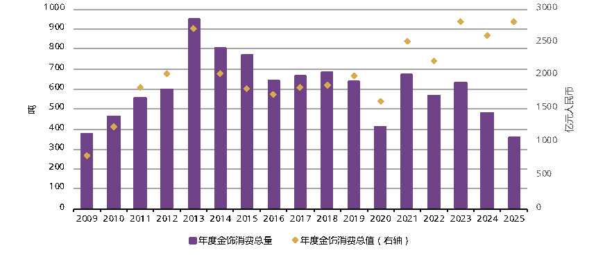 金饰克价上涨限制消费者购买力 金饰方面,2025年全年金饰需求总量达360吨,同比减少25%。不过,从消费金额维度来看,四季度中国消费者金饰支出 达778亿元人民币(约合110亿美元),同比增长19%;全年累计支出2814亿元人民币(约合394亿美元),同比增幅为 8%。 1月29日,世界黄金协会更新关于中国黄金市场的观察报告。2025年四季度,中国市场黄金投资与消费需求(含金饰、金 条、金币、黄金ETF及工业用金)总量达274吨,年同比增长18%,较三季度大幅攀升60%,同时创下历年四季度第二亮眼 表现,仅次于2016年同期。 2025年全年,中国黄金市场需求总量达1003吨,同比增长6%,为2021年以来最高水平。按金额计,全年需求更是创下历 史新高,总额达7960亿元人民币(约合1110亿美元),同比激增53%。值得注意的是,年内强劲的黄金投资需求抵消了金 饰板块的疲软态势。 值得关注的是,全年金饰"以旧换新"业务(消费者将旧首饰折算后补足差价及额外工费换购新首饰)持续火爆,有效缓解 了消费者购买力不足的问题。世界黄金协会认为,这一趋势是中国消费者对金饰兴趣持续高涨以及市场流动性不断提升的 积极信号。 ...