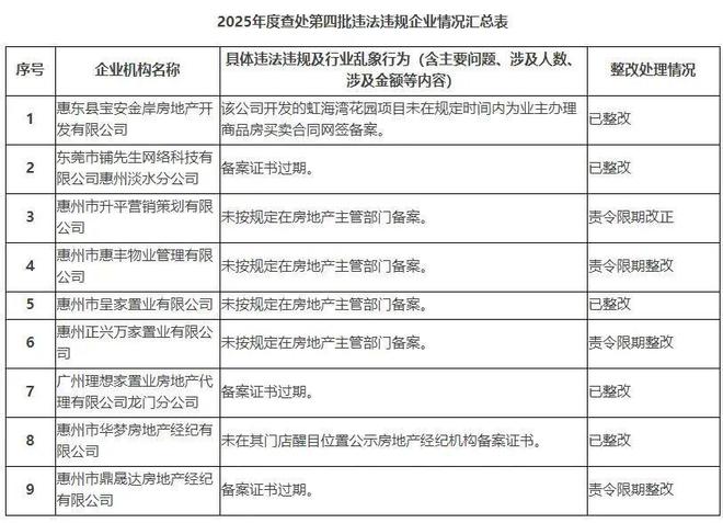 近日,惠州市住房和城乡建设局在官网发布《关于2025年度查处第四批违法违规房地产开发企业、中介 机构名单的公告》,对2025年度第四批惠州各县(区)住建部门组织查处的房地产开发企业、中介机构 违法违规及行业乱象行为向社会进行公告。 具体到违法违规行为上,开发企业惠东县宝安金岸房地产开发有限公司,开发的虹海湾花园项目未在规 定时间内为业主办理商品房买卖合同网签备案。惠州市升平营销策划有限公司等四家公司存在未按规定 在房地产主管部门备案的违规违法行为。东莞市铺先生网络科技有限公司惠州淡水分公司等三家公司, 备案证书过期。惠州市华梦房地产经纪有限公司,未在其门店醒目位置公示房地产经纪机构备案证书。 此次惠州住建局通报9家违法违规企业中,包括1家开发企业,8家中介机构。整改处理情况显示,5家已 整改完毕,4家被责令限期整改。 | 序号 | 企业机构名称 | 具体违法违规及行业乱象行为(含主要问题,涉及人数、 | 整改处理情况 | | --- | --- | --- | --- | | | | 涉及金额等内容) | | | 1 | 惠东县宝安金岸房地产开 | 核公司开发的虹海湾花园项目未在规定时间内为业主办理 | 已整 ...