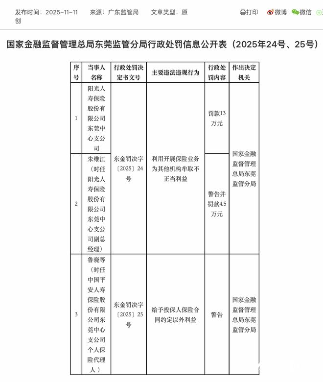 东莞三家保险公司被监管点名,阳光人寿被罚款17.5万