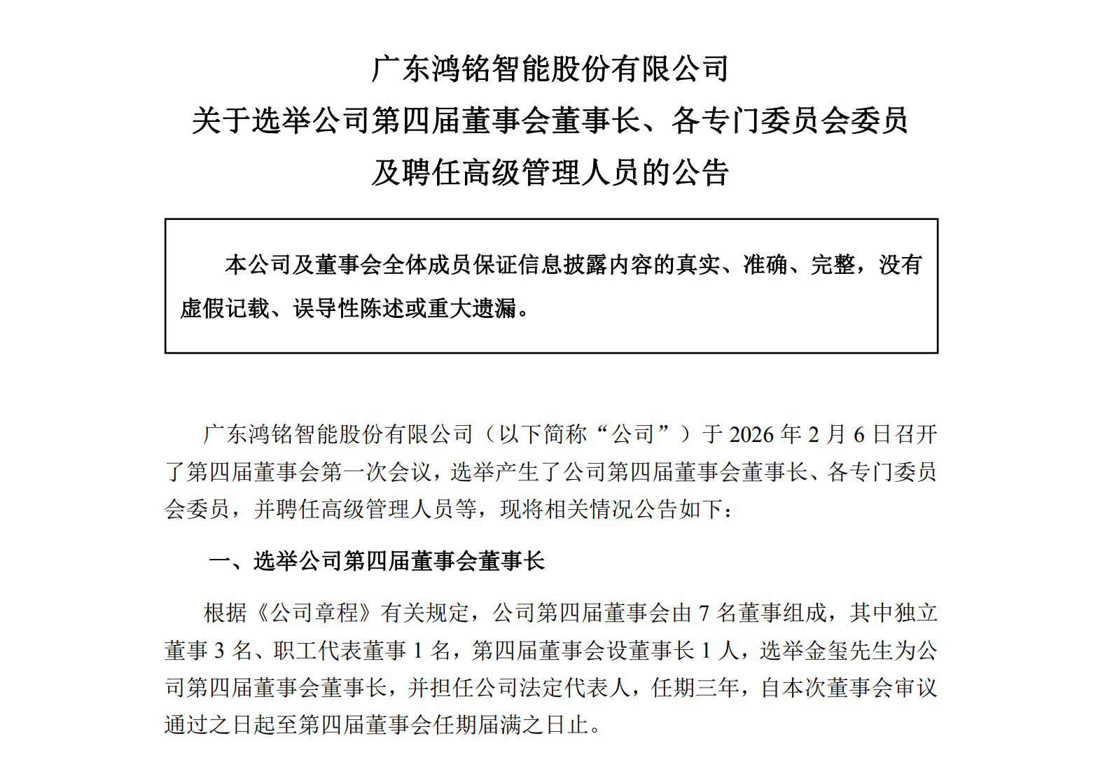 2月7日,广东鸿铭智能股份有限公司(以下简称"鸿铭股份")发布公告称,该公司于2026 年2 月6 日召开了第四届董事会第一次会议,选举产生了公司第四 届董事会董事长、各专门委员会委员,并聘任高级管理人员等。其中,2000年出生的金玺被选为董事长,并被聘任为公司总经理。 公告显示,根据《公司章程》有关规定,鸿铭股份第四届董事会由7 名董事组成,其中独立董事 3 名、职工代表董事 1 名,第四届董事会设董事长1 人,选 举金玺为公司第四届董事会董事长,并担任公司法定代表人,任期三年。同时,经公司第四届董事会第一次会议审议通过,同意聘任金玺为公司总经理。 简历显示,金玺,2000年出生,中国国籍,无境外永久居留权,本科毕业于纽约大学机械工程专业,研究生毕业于哥伦比亚大学企业风险管理专业。从2022 年6月起,金玺开始在鸿铭股份任职,先后担任机械装配员、研发工程师助理、鸿铭国际(香港)有限公司董事、董事长助理等职务。 公开资料显示,金玺为鸿铭股份实控人金健、蔡铁辉夫妇之子。截至目前,金健、蔡铁辉分别直接持有公司股份34.88%、25.50%,系公司前两大股东;同 时,两人还分别通过涵和祺颂、灏德祺颂控制上市公司3. ...