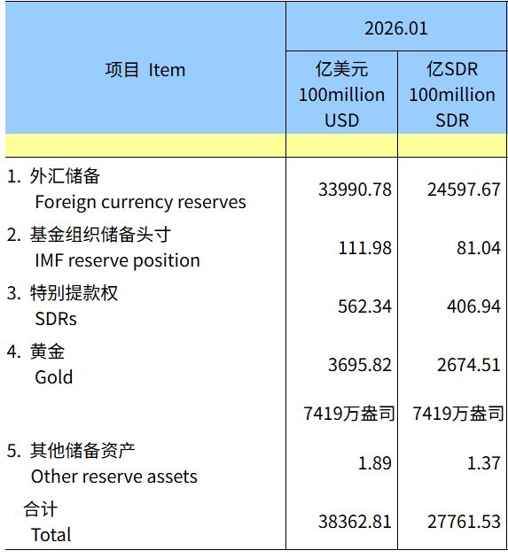Core Viewpoint - The People's Bank of China has increased its official foreign exchange reserves and gold reserves, indicating a strategic shift towards optimizing international reserve structures amid rising geopolitical risks and fluctuating gold prices [1][2]. Group 1: Foreign Exchange Reserves - As of January 2026, China's foreign exchange reserves reached $339.91 billion, an increase of $4.12 billion (1.23%) from December 2025 [1]. - The total official reserve assets amounted to $38,362.81 million, with foreign currency reserves being the largest component [1]. Group 2: Gold Reserves - China's gold reserves stood at 74.19 million ounces as of January 2026, with an increase of 40,000 ounces from the previous month [1]. - The central bank has increased its gold reserves for the 15th consecutive month, although the increase has been at a low level for the 11th month in a row [1]. - In 2025, China's official gold reserves increased by 860,000 ounces (approximately 24.38 tons), contributing significantly to global gold demand [3]. Group 3: Strategic Insights - Analysts suggest that the recent small increases in gold reserves during a period of rising international gold prices signal a move towards optimizing the structure of international reserves [2]. - The proportion of gold reserves in China's total official international reserves is approximately 9.7%, which is significantly below the global average of around 15%, indicating a need for continued accumulation of gold reserves [2].