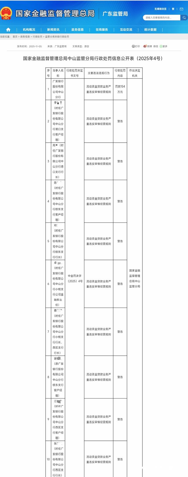 罚款154万元!广发银行中山分行9人被行政处罚