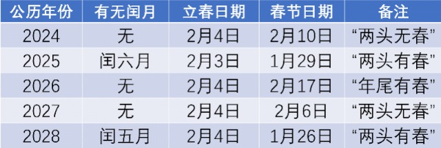 近日,网络上流传"2026马年是'无春年',不宜婚嫁"的说法,引发关注。2月15日,广东天文学会常务 理事陈欣欣告诉南都N视频记者,即将到来的农历丙午马年并非没有"立春日","因为2027年的大年初 一在2月6日,马年其实包含了2027年的立春日。" | | 公历年份 有无闰月 立春日期 | | 春节日期 备注 | | --- | --- | --- | --- | | 2024 | 元 | 2月4日 | 2月10日 "两头无春" | | 2025 | 润六月 | 2月3日 | 1月29日 "两头有春" | | 2026 | 元 | 2月4日 | 2月17日 "年尾有春" | | 2027 | 元 | 2月4日 | 2月6日 "两头无春" | | 2028 | 间五月 | 2月4日 | 1月26日 "两头有春" | 近几年立春日期情况。受访者制图。 "事实上,年年都有几百万对结婚,日子过得好不好,与农历年有没有'春'没有任何关系。"陈欣欣提醒 公众,历法有自身的严谨性,不宜过度解读。 陈欣欣还特别指出,真正"两头无春"的是下一个农历年,2027年丁未羊年(从2027年2月6日到2028年1 月25日)。"这也 ...