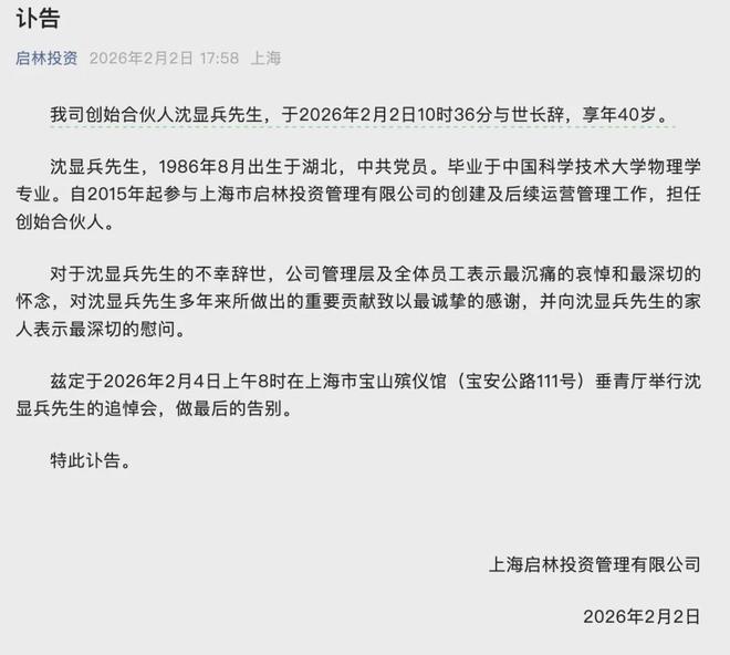 2月2日,上海启林投资管理有限公司发布讣告,公司创始合伙人沈显兵先生,于2026年2月2日10时36分 与世长辞,年仅40岁。 据讣告,沈显兵,1986年8月出生于湖北。毕业于中国科学技术大学物理学专业。自2015年起参与上海 市启林投资管理有限公司的创建及后续运营管理工作,担任创始合伙人。 据该公司微信号介绍,上海启林投资管理有限公司成立于2015年5月28日,是一家专注于量化投资的基 金管理公司。启林投资创始人王鸿勇毕业于中国科学技术大学物理学专业。 据21世纪经济报道,截至2025年10月,启林投资管理规模达150亿人民币,是国内管理规模领先的量化 私募之一。 2月2日晚,南都记者注意到,上海启林投资管理有限公司的微信号头像已变为黑白色。 南方都市报(nddaily)报道 ...