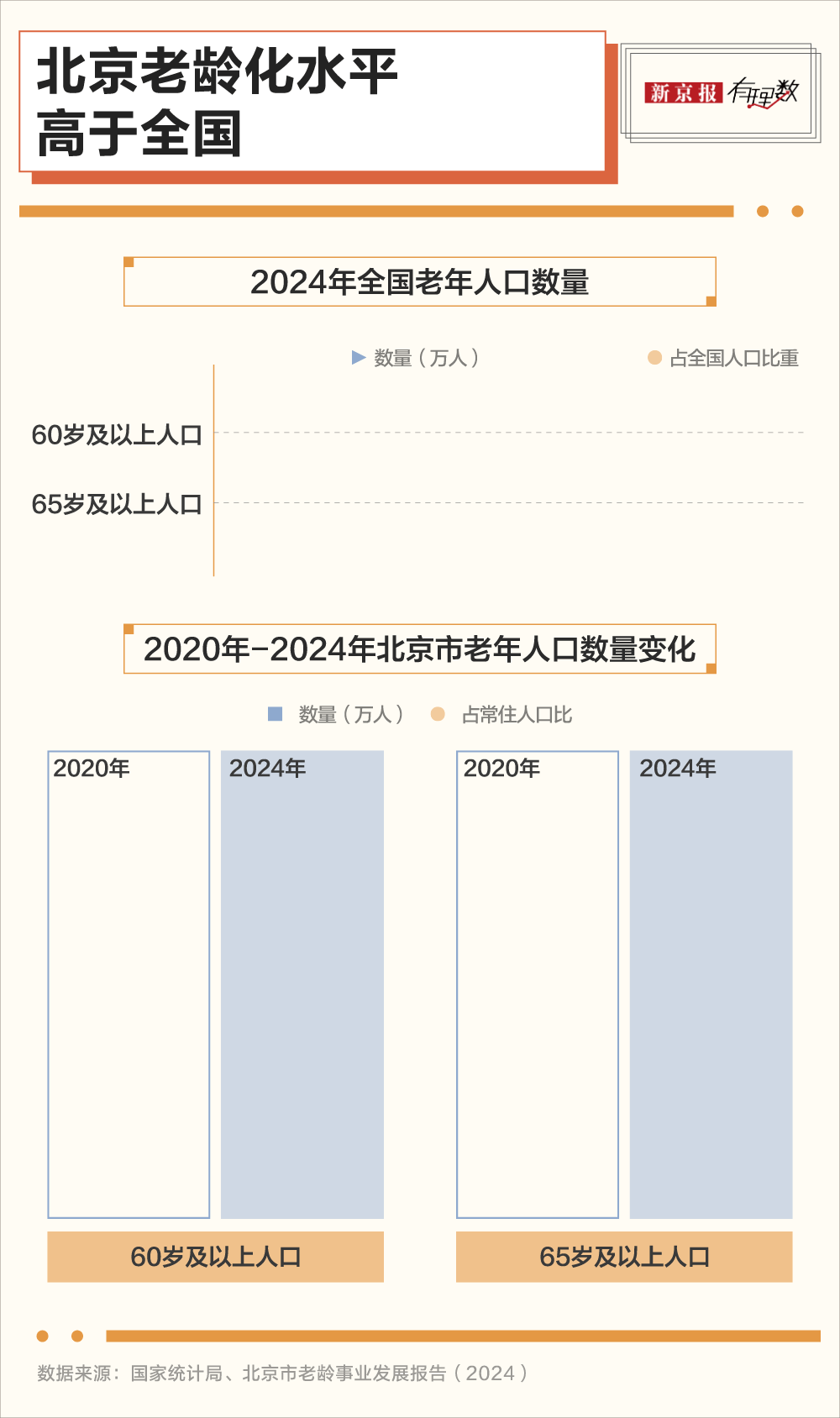 2026年2月10日,习近平总书记走进北京新街口街道,实地察看父母食堂、银龄老年公寓,从一碗热饭、一间居室、一项服务,细致询问老年群体的日常 照料与生活保障情况。 总书记的到来让这条街道变得热闹,不少人特意来打卡参观。 这条小小的街道,映照出我国养老事业的民生温度,也让我们看到,积极应对人口老龄化,从来都不是遥远的战略规划,正落在一个个看得见、摸得着的 日常细节里。 北京老龄化水平高于全国 在党的二十届四中全会上,习近平总书记对积极应对人口老龄化作出全面系统谋划,强调要实施积极应对人口老龄化国家战略,突出办好老有所养、老有 所为这件国之大事,推动老龄事业高质量发展,让老年人安享幸福晚年。 从我国的人口数据来看,老龄化早已不是遥远的趋势,而是正在发生的国情。随着我国居民人均预期寿命不断提高,低生育率与人口结构转型叠加,整个 社会正稳步迈入深度老龄化阶段。 根据国家统计局数据,截至2024年末,全国60周岁及以上老年人口达到31031万人,占总人口比重22.0%;65周岁及以上人口22023万人,占比15.6%。 作为超大城市和首都,北京的老龄化进程比全国更早、程度更深,也更早面对养老服务的现实考题。数据统计,2 ...
