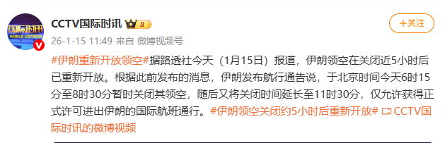 据@CCTV国际时讯消息,据路透社今天(1月15日)报道,伊朗领空在关闭近5小时后已重新开放。根 据此前发布的消息,伊朗发布航行通告说,于北京时间今天6时15分至8时30分暂时关闭其领空,随后又 将关闭时间延长至11时30分,仅允许获得正式许可进出伊朗的国际航班通行。 ...