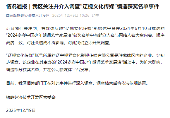 新京报讯 12月9日,铁岭经济技术开发区管委会发布情况通报,内容如下: 近日我们关注到,有媒体反映"辽视文化传媒"新媒体平台在2024年6月10日推送的"2024多彩中国少年朗 诵艺术家展演"获奖名单中有部分人名与网络人名大全内容、顺序高度一致,对社会造成不良影响。对 此我们立即开展调查。 "辽视文化传媒"账号所属的辽宁视界文化影视传媒有限公司是驻我辖区内的企业。经初步调查,该企业 在其主办的"2024多彩中国少年朗诵艺术家展演"活动中,为扩大影响,编造部分获奖名单,并在公司新 媒体平台发布。 目前,我区相关部门正在对此事件进行深入调查,调查结束后将依法依规处置。 ...