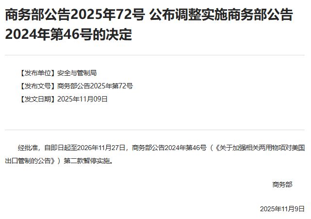 11月9日,商务部公告2025年72号发布: 经批准,自即日起至2026年11月27日,商务部公告2024年第46号(《关于加强相关两用物项对美国出口 管制的公告》)第二款暂停实施。 据此前介绍,商务部公告2024年第46号如下: 来源 商务部、新京报政事儿 值班编辑 康嘻嘻 星标"新京报" 及时接收最新最热的推文 点击"在看",分享热点 ...