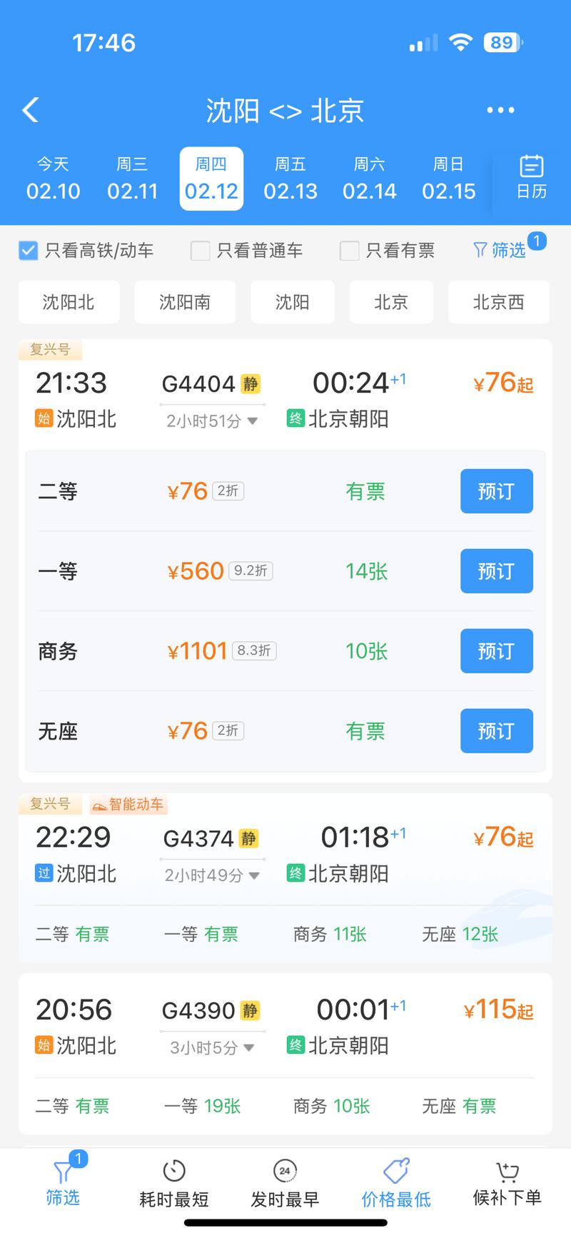 今天(2月10日)是北方小年,北京各大火车站内人流如织,而在庞大的出京客流之外,一些春运期间的进京折扣 车票,也凭借着超值的价格优势吸引了一些"反向春运"的探亲者和游客。其中,部分车次的最低票价能低至公布 票价的两折。比如2月12日沈阳北站到北京朝阳站的G4404次列车,其二等座执行2折票价,仅为76元。 今年铁路部门继续对春运部分非热门线路车票实行最低2折优惠票价,为旅客出行提供更多选择。 花76元坐高铁可从沈阳到北京 春运期间,铁路客流具有明显的单向特征。铁路部门充分发挥市场化票价机制作用,针对包括进京方向在内的部 分非热门线路推出打折优惠措施,这一市场化手段既能让选择"反向春运"或错峰出行的旅客得到实惠,拥有多样 化出行选择,也能通过价格杠杆有效调节客流,引导旅客错峰出行,促进铁路运输资源充分利用,激活了闲置运 力,推动春运客流"双向奔赴"、更加均衡。 "沈阳北到北京朝阳,76元!"2026年春运期间,这样的优惠票价在12306App上不时出现。平时沈阳北至北京朝阳 的高铁票价普遍在300元以上,而春运期间G4404次列车二等座票价低至76元,相当于打了2折。 不同类别的车次折扣也有所差异,最大的折扣力 ...