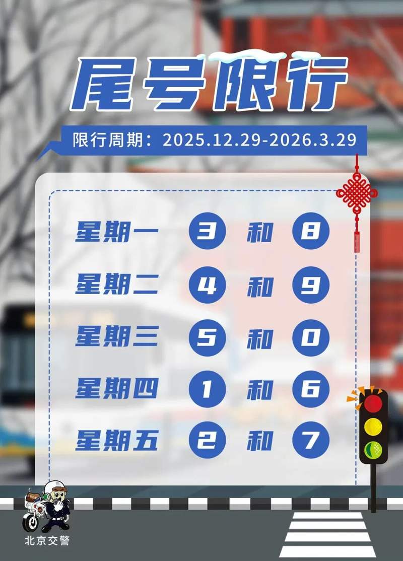 新京报讯 北京交警官微发布出行提示:2025年12月29日起,尾号限行将进行轮换;多场跨年迎新、演出比赛、冰 雪主题活动等将成为出行热点;工作日早晚高峰通行压力较大,早间学校、医院周边车流短时集中;12月31日晚 高峰时间将提前并延长,晚间多地将举办跨年迎新活动。 交通热点预测 2025年12月29日起,尾号限行轮换 2025年12月29日起,北京市将迎来新一轮限行尾号轮换。按照市政府通告,自2025年12月29日至2026年3月29日, 星期一至星期五机动车限行车牌尾号分别为:3和8、4和9、5和0、1和6、2和7。 12月31日晚高峰提前,跨年夜迎新活动密集 2025年12月31日晚高峰将提前至下午,持续时间也将延长,城区主要道路以及大型商圈、餐饮娱乐场所集中地点 将出现车流集中的情况。 据文旅部门通报,蓝色港湾、五棵松、宛平城、首钢园、西红门荟聚、湾里综合体、密云古北水镇等地将举办跨 年活动,部分地区将举行灯光秀,2025年12月31日下午至2026年1月1日凌晨,上述地区将吸引大量客流前往,建 议前往参与的市民提前规划好行程安排。 针对跨年活动密集的情况,交管部门将增派警力加强活动场地周边疏导维护,在 ...