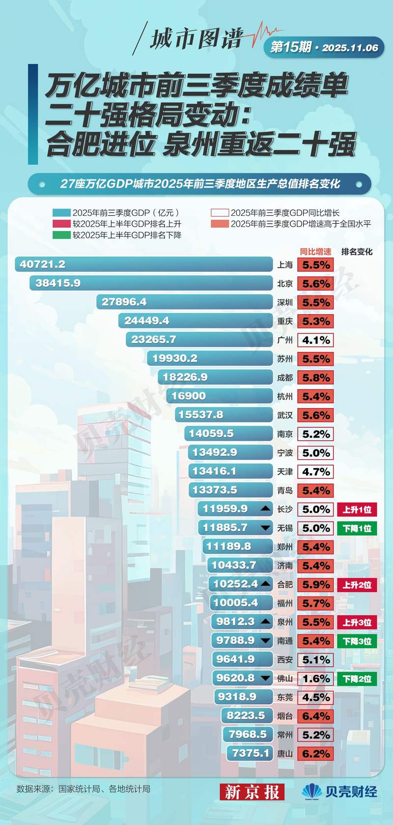 (文章来源:新京报) 年内,万亿城市"二十强"榜单变动不断:泉州连续两个季度排名上升,超过南通,重新回归前二十行列;南通上 半年强势上涨,排名较去年年末提升5位,三季度增速有所放缓,跌出二十强;合肥继续保持高速增长,上升2位 至第18位;佛山则在二季度跌出二十强后,继续下滑2位,增速为1.6%。 从经济总量来看,目前已有19城GDP突破万亿元;其中,上海站上"四万亿元"台阶,北京超3.8万亿元,深圳、重 庆、广州均超过两万亿元。 27座万亿城市公布前三季度成绩单,其中17城跑赢全国增速。 截至11月6日,27座万亿城市前三季度经济数据全部出炉。其中,17城GDP增速跑赢全国增速。烟台以6.4%继续 领跑,唐山、合肥分列第二、第三,GDP增速分别为6.2%、5.9%。 ...