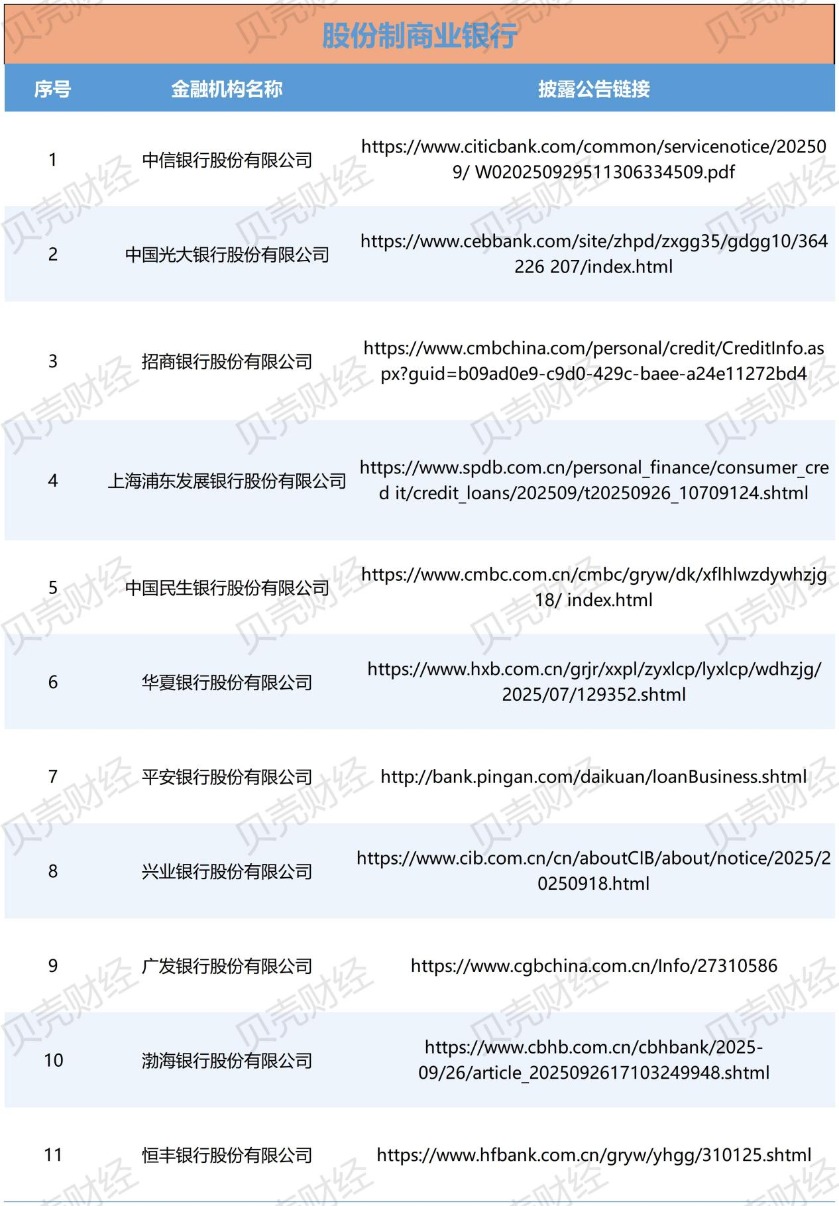 11月4日,中国互联网金融协会(即"中互金")发布公告,汇总了截至10月31日国内119家金融机构互联网助贷业务合作机构名单的披露情况。值得关注的 是,中互金明确提出,当前金融机构在披露助贷合作方名单时存在四大不规范、不准确的情况。 记者看到,这119家金融机构以类型划分具体包括:11家全国性股份制银行、39家城商行、5家农商行、16家民营银行、10家外资银行、30家消费金融公司、 7家信托公司、1家直销银行。 图/11家全国性股份制银行披露助贷合作机构的链接(新京报贝壳财经记者根据中互金信息制图) 图/39家城商行披露助贷合作机构的链接(新京报贝壳财经记者根据中互金信息制图) 图/5家农商行披露助贷合作机构的链接(新京报贝壳财经记者根据中互金信息制图) 图/16家民营银行披露助贷合作机构的链接(新京报贝壳财经记者根据中互金信息制图) 金融机构名称 披露公告链接 序号 https://www.hkbea.com.cn/PersonalBusiness/PersonalLoan 1 东亚银行(中国)有限公司 s/ConsumerLoans/myxyg/202506/t20250613_21003.shtml h ...