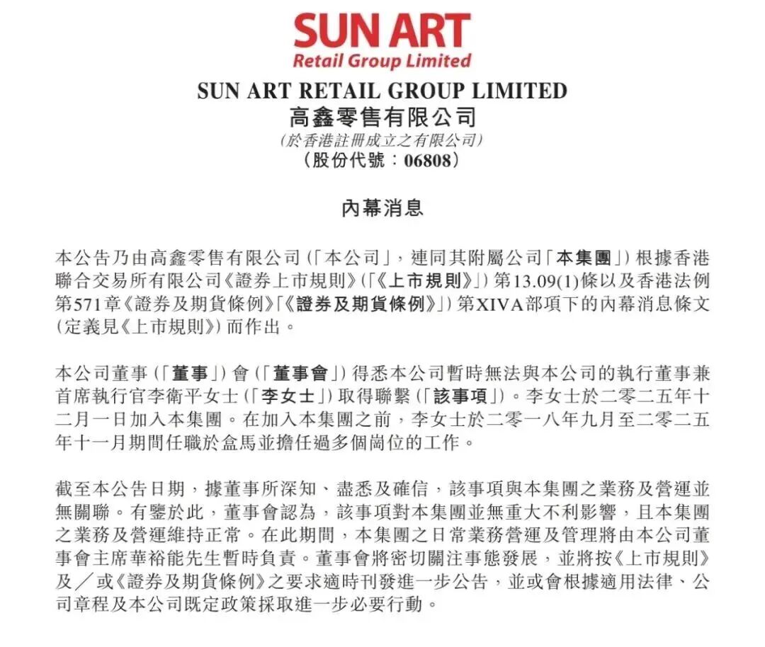 2月4日,大润发母公司高鑫零售有限公司(高鑫零售,6808.HK)在港交所发布公告称,公司董事会得悉,本公司暂时无法与执行董事兼首席执行官李卫 平取得联系。 公告称,截至本公告日期,据董事所深知、尽悉及确信,该事项与本集团之业务及营运并无关联。有鉴于此,董事会认为,该事项对本集团并无重大不利 影响,且本集团之业务及营运维持正常。在此期间,本集团之日常业务营运及管理将由本公司董事会主席华裕能暂时负责。 近日,有消息称,大润发母公司高鑫零售CEO李卫平被警方带走协助调查,上周五开始已未出现在公司。2月3日,有媒体报道称,高鑫零售方面回应表 示:"假的,在报警了",并称李卫平目前正在上班。 公开信息显示,李卫平有26年零售行业经验,2025年11月任高鑫零售执行董事兼首席执行官。 据介绍,大润发母公司高鑫零售是拥有多业态及多渠道电商业务的零售商。公司成立于2011年,同年7月在香港上市(高鑫零售6808.HK)。截至2025年9 月30日,高鑫零售共有462家大卖场、32家中型超市以及七家M会员店,其中约65%为租赁门店,35%为自有物业门店。 ...